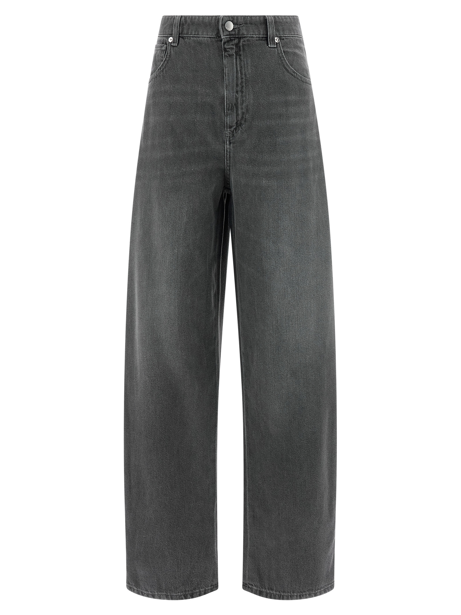 'SmmAllegra' cotton denim and garment-treated viscose jeans, crop style with wide curved leg, zip and front button closure, five pockets, and leather logo label at the back.