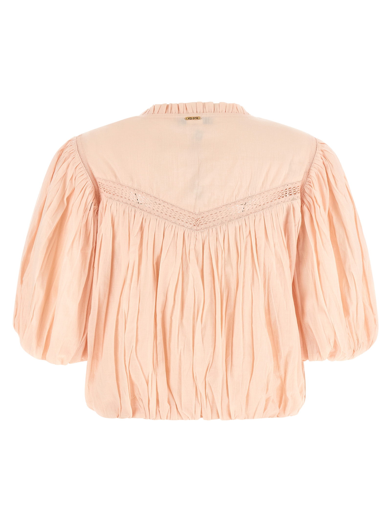 Cotton blouse, V-neck with ruffle detail, lace insert, doubled fabric with crinkled pattern, 3/4 sleeves, elastic on the bottom of the garment and on the sleeves.