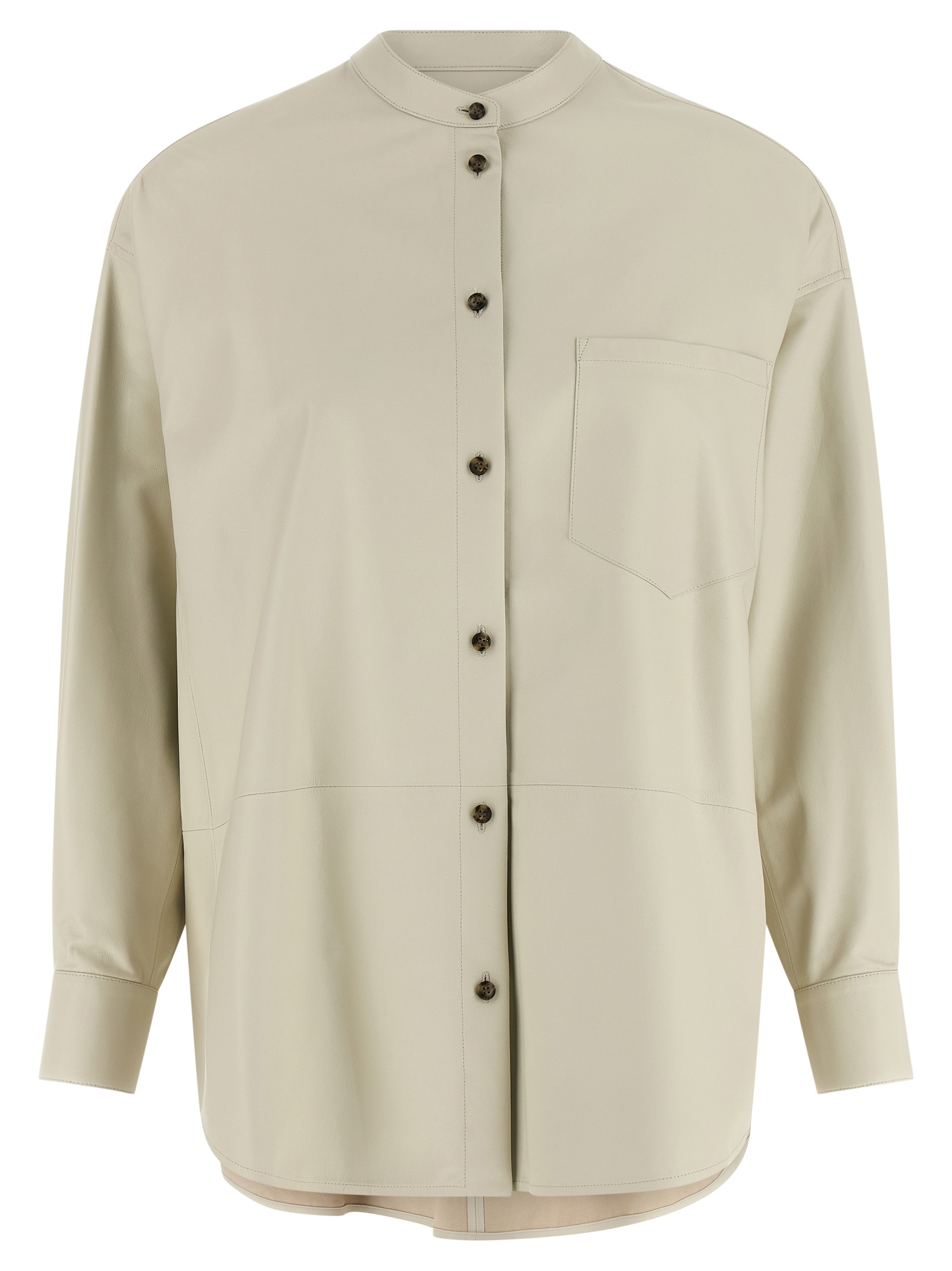 Легкая кожаная рубашка без подкладки с воротником-стойкой, застежкой на пуговицы спереди, длинными рукавами с манжетами и пуговицами, асимметричным закругленным низом с боковыми разрезами, передним накладным карманом и строчкой в ​​тон.