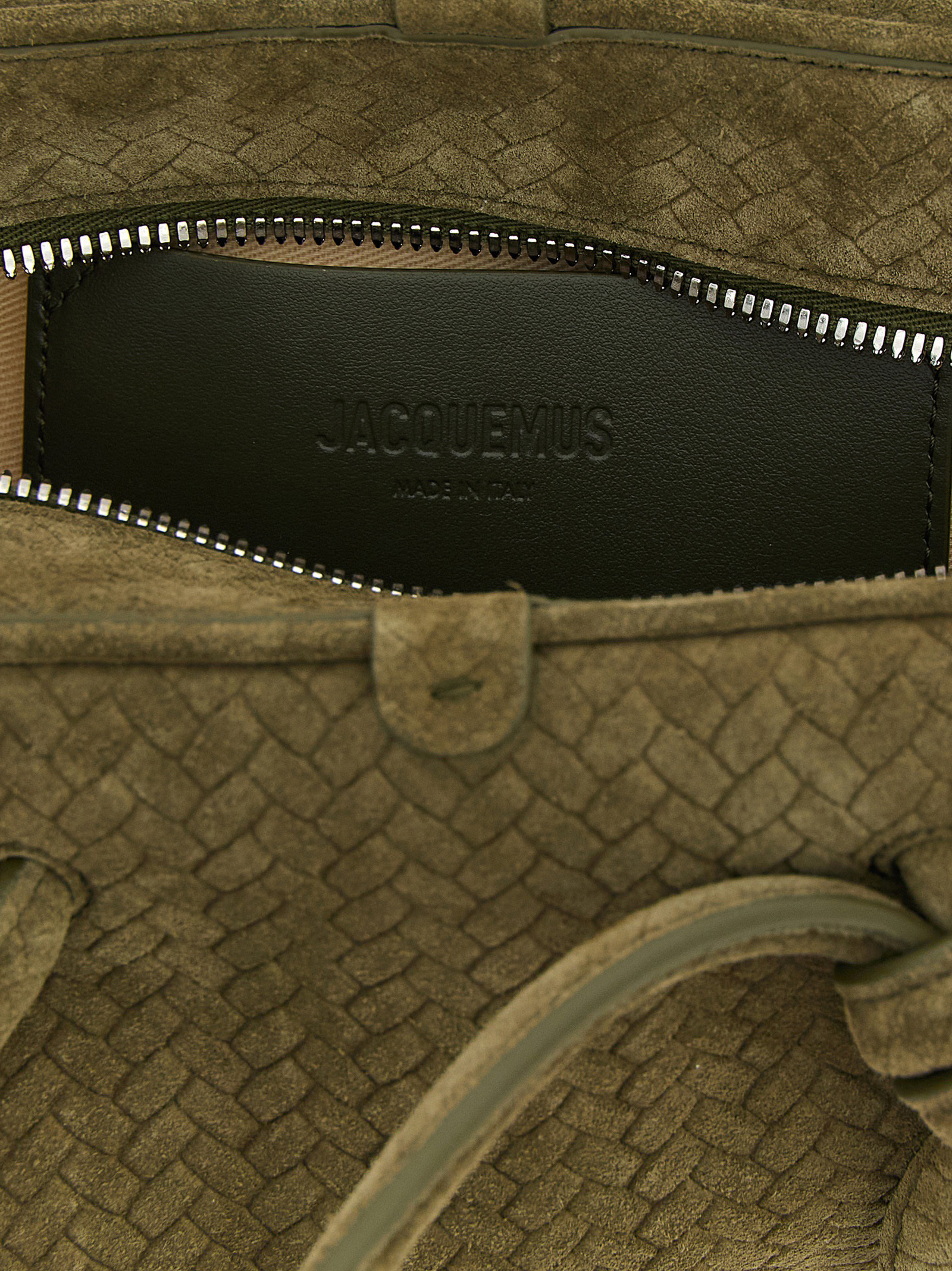 Le Petit Turismo' bowling handbag woven suede with chevron pattern, front embossed logo, double fixed tubular handle with tone-on-tone bow detail, top zip closure, adjustable and removable shoulder strap. Each leather is unique and has been carefully selected by a team of artisans. The model may have any imperfections or natural color variations.
