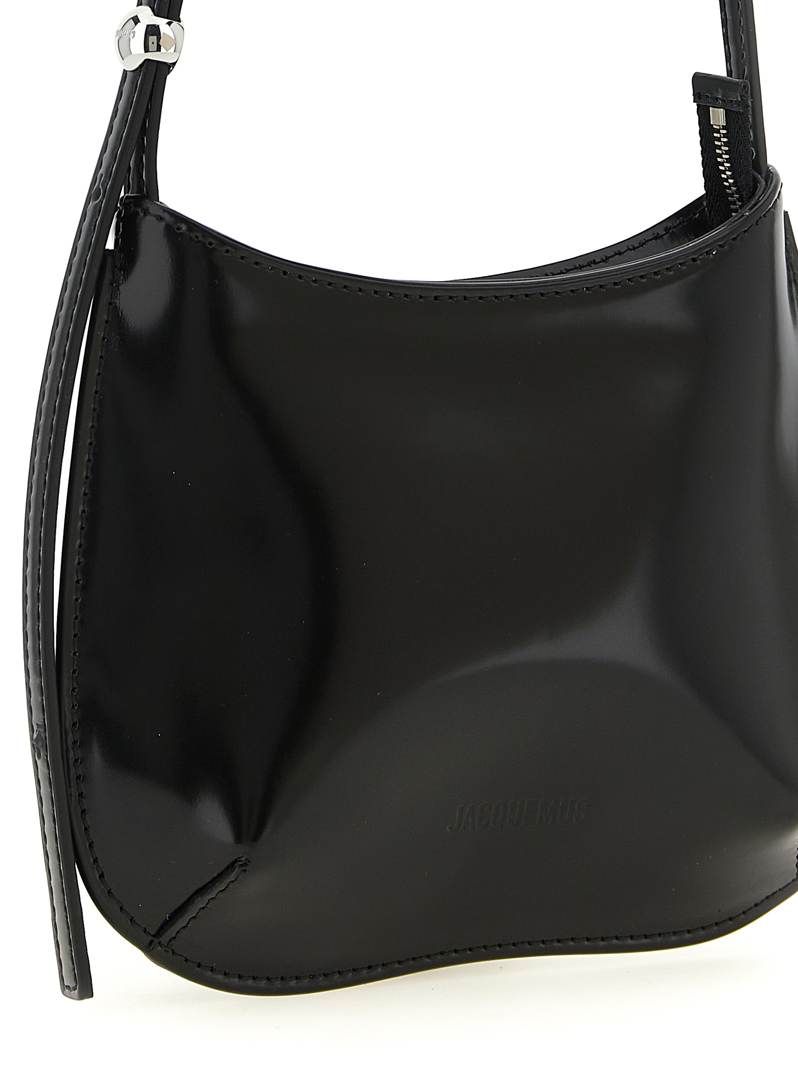 'Le Petit Bisou' glossy leather shoulder bag with front embossed logo, top zip closure, adjustable handle.