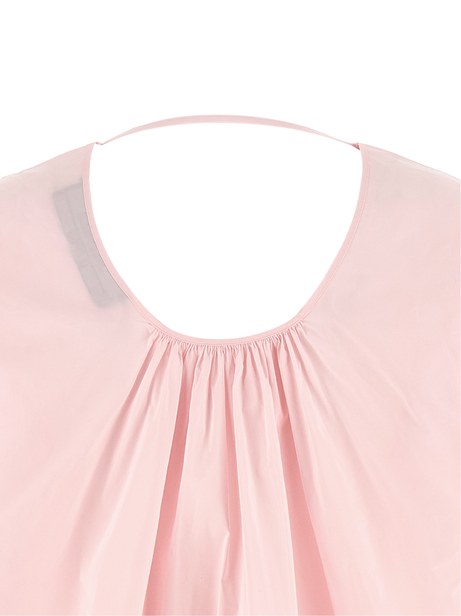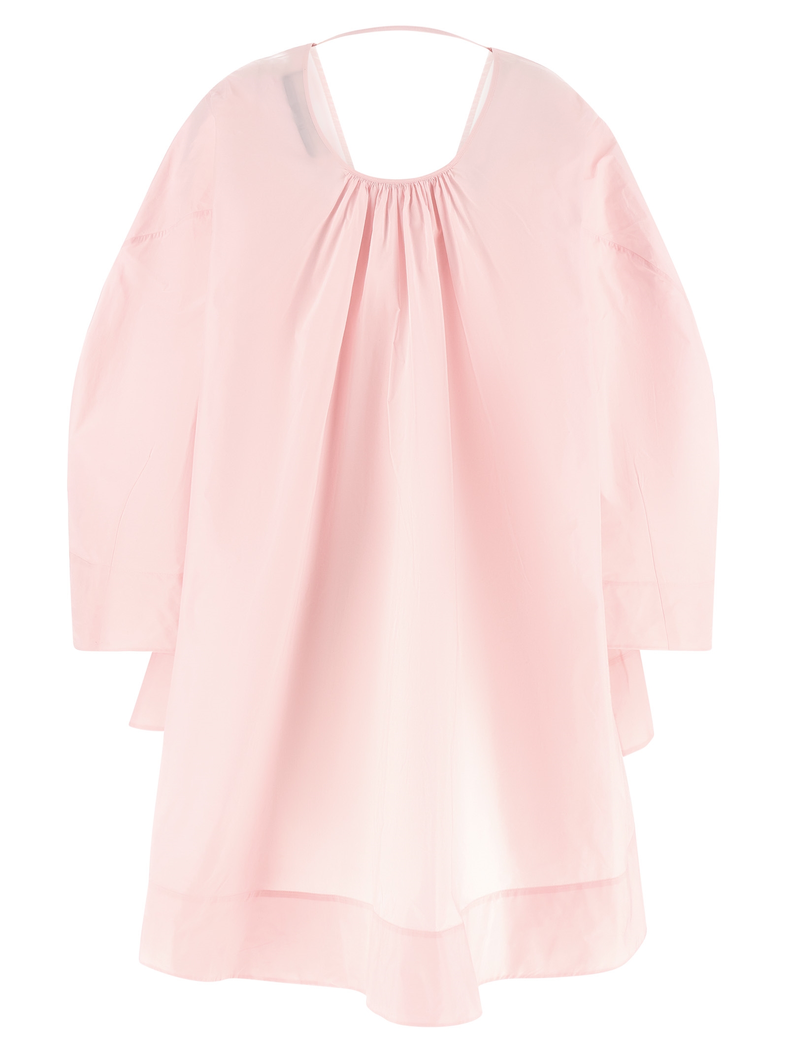 'La Robe Paysan' mini dress in textured transparent cotton poplin with tunic style, flared silhouette, wide front V-neck, wide and curved long sleeves, round back neckline with fixing strap, rounded and asymmetrical hem.