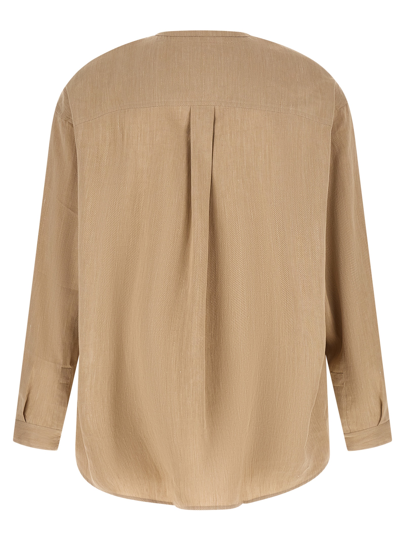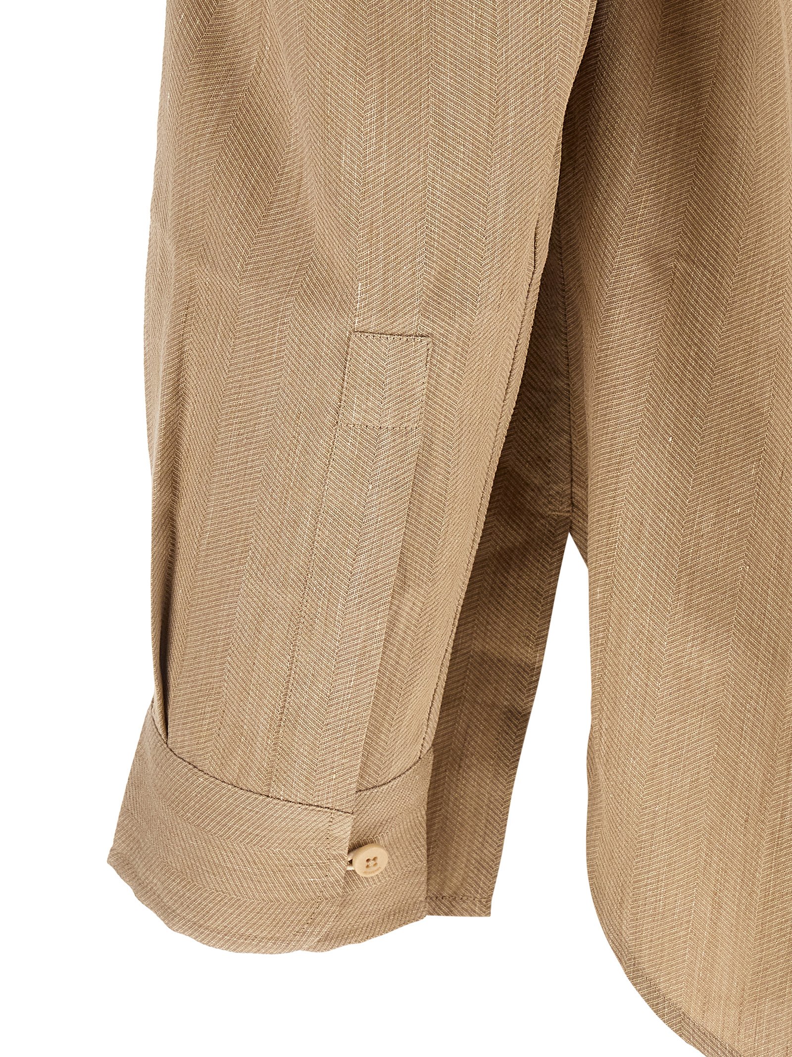 'La Chemise Pastro' shirt in textured linen with chevron pattern, crew neck, tone-on-tone logo embroidery and button closure with front horn effect, long sleeves with cuffs and dropped shoulder, back rack with cannon pleats, rounded and asymmetrical hem.