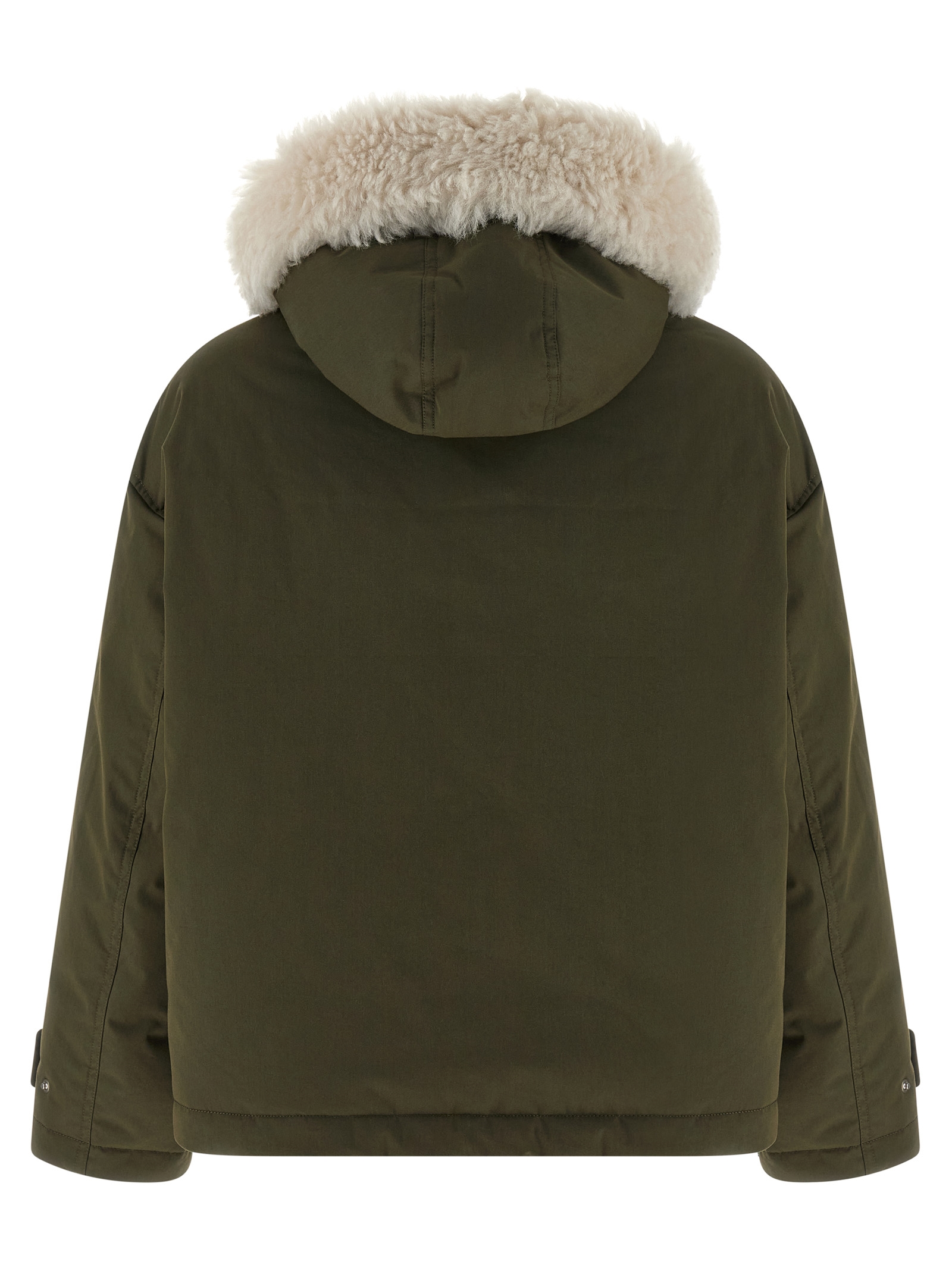Short parka in waterproof cotton fabric, quilted fabric lining and goose down padding, adjustable hood with Merino Shearling lining and long-haired sheepskin, zip closure and front snap buttons, pockets, long sleeves with cuffs and dropped shoulder.