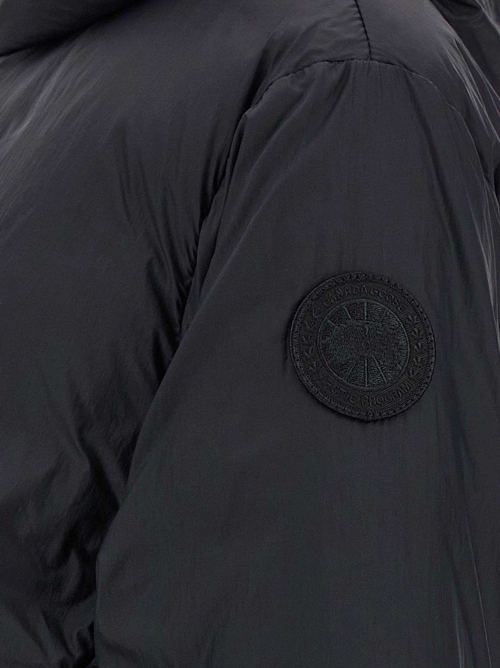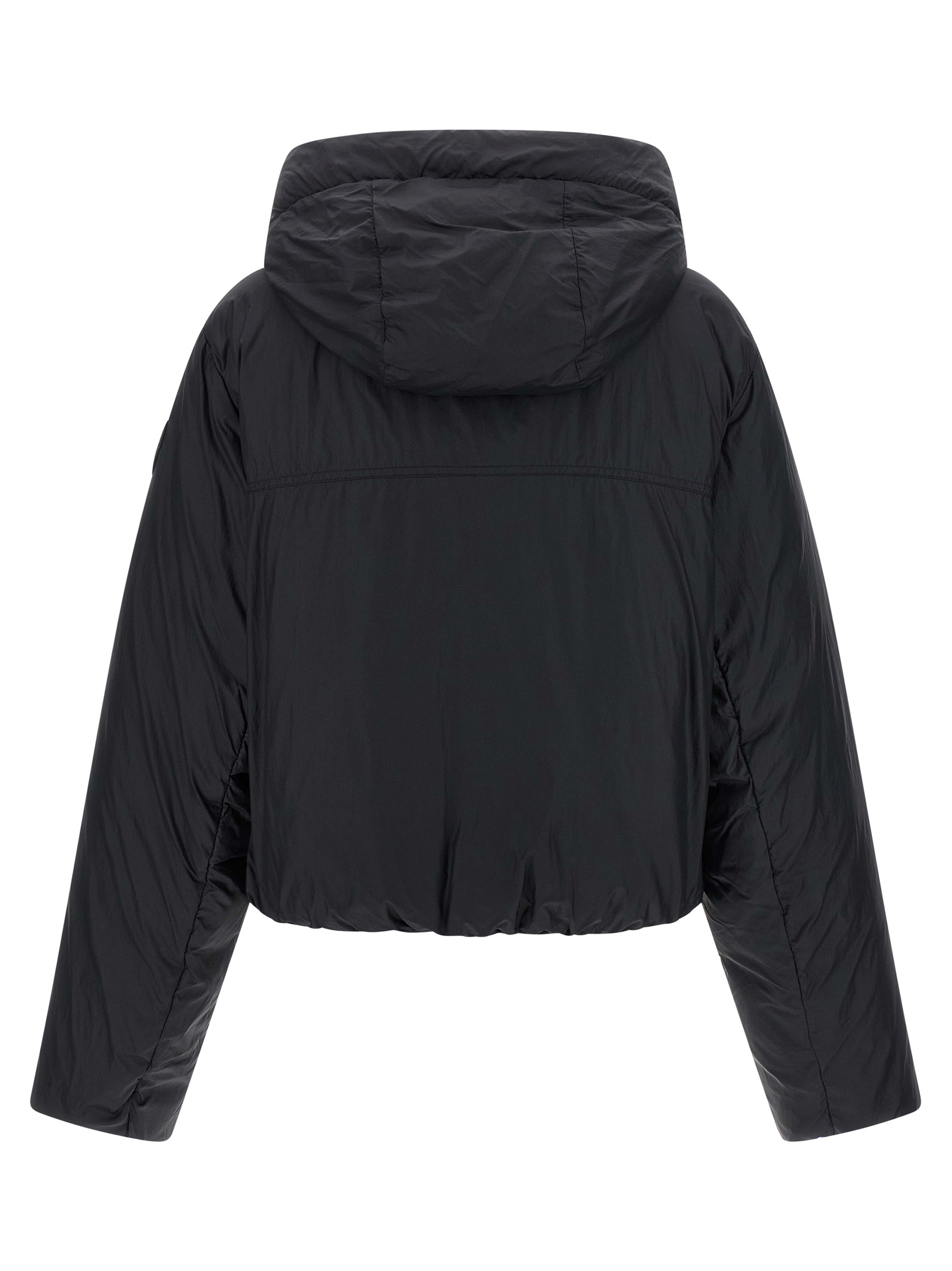 'Elba Jacket' cropped hooded down jacket in slightly padded windproof fabric with elastic bands and adjustable drawstring at the hem, side pockets, tone-on-tone side logo patch, long sleeves with knitted cuffs.