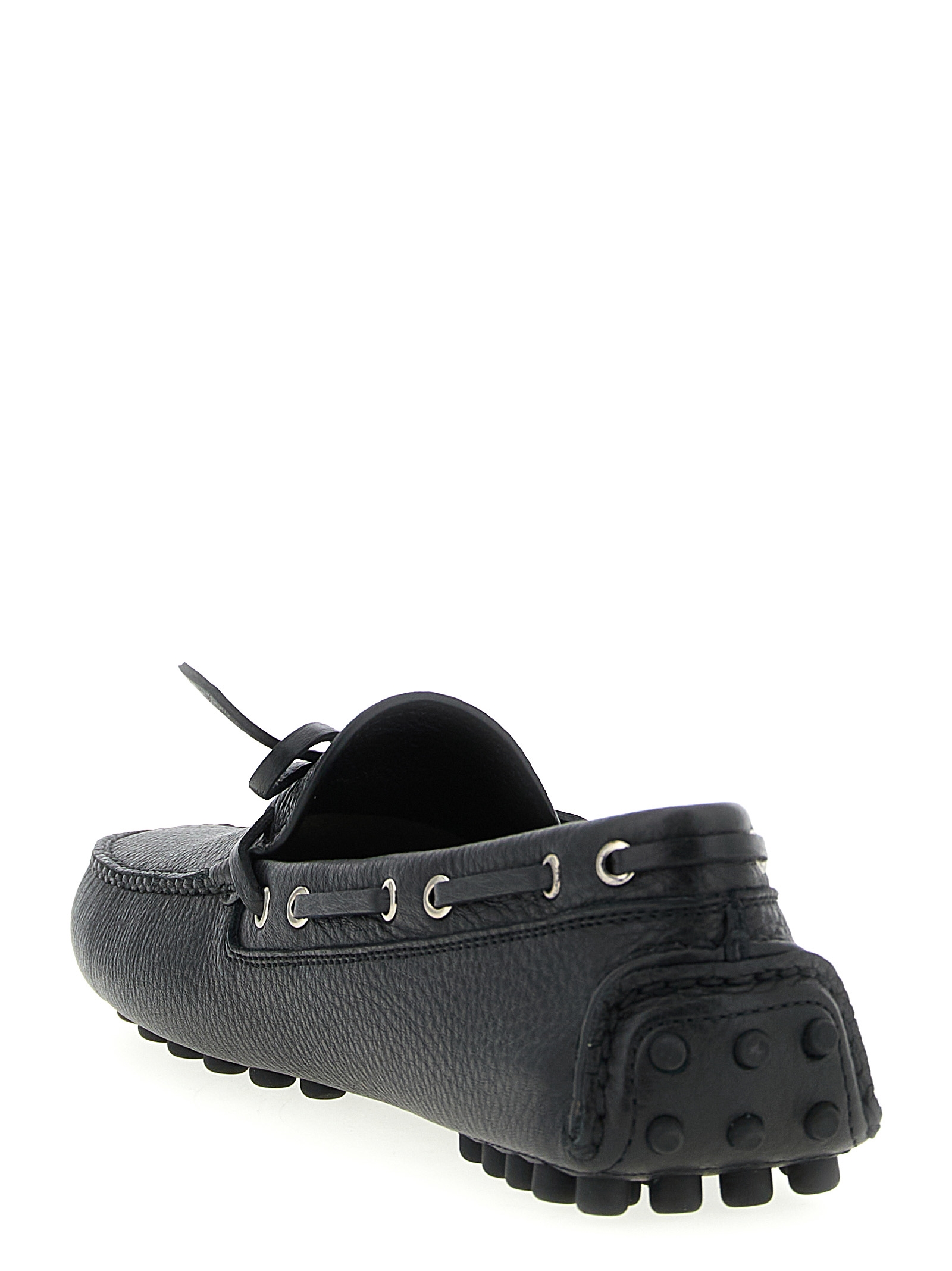 Hammered leather loafers with triangular front logo in enamelled metal, front laces, rubber sole.
