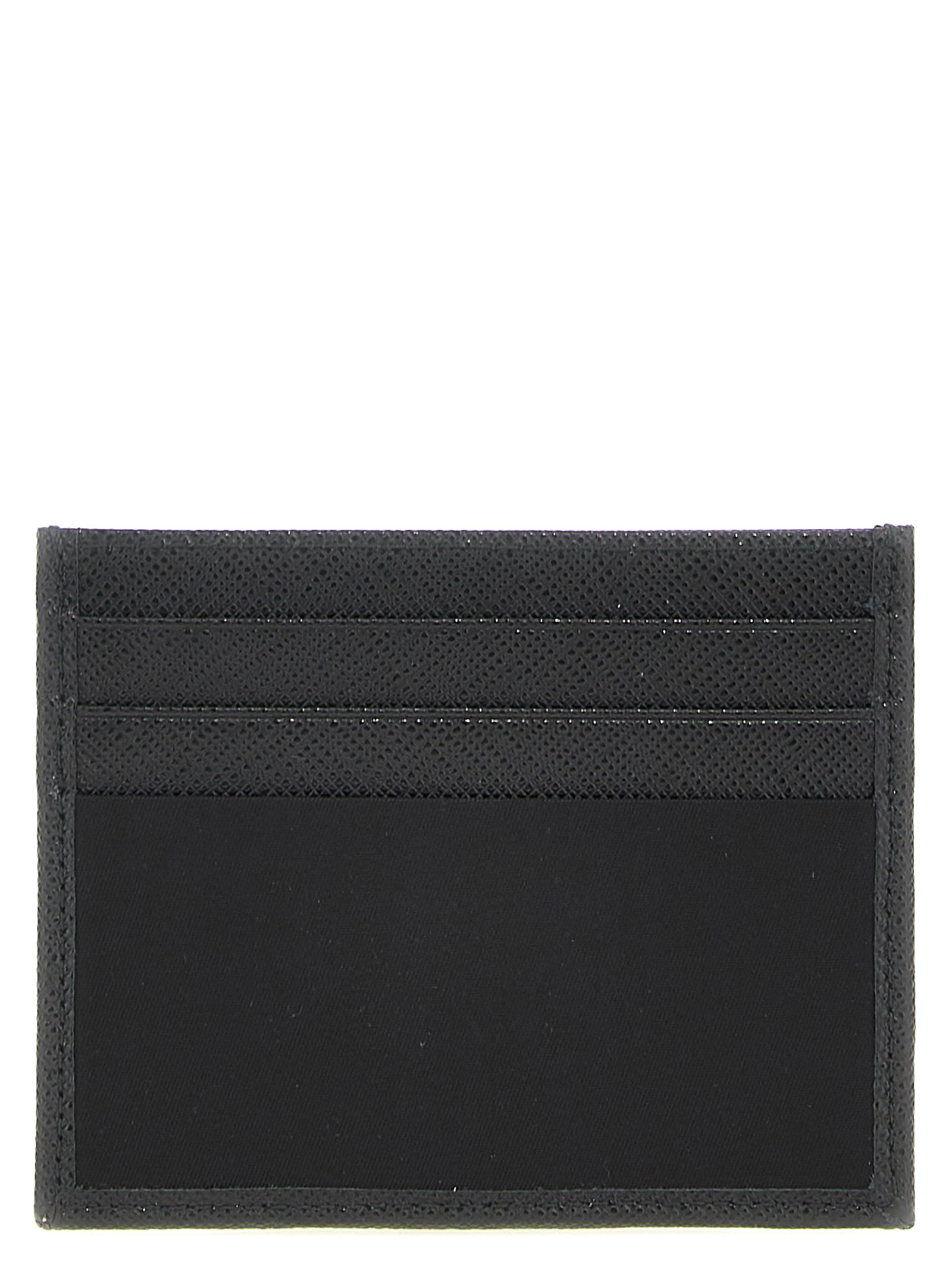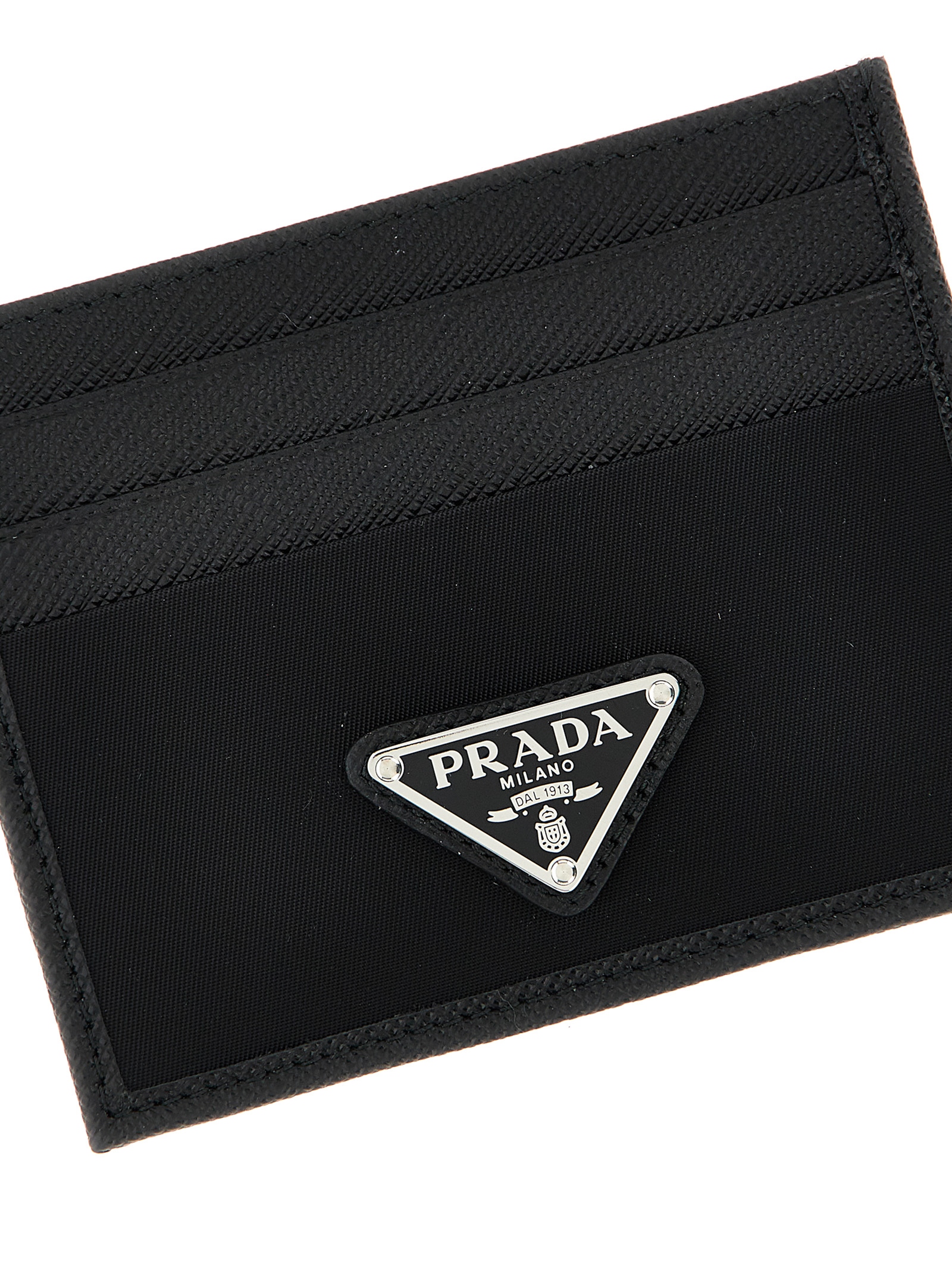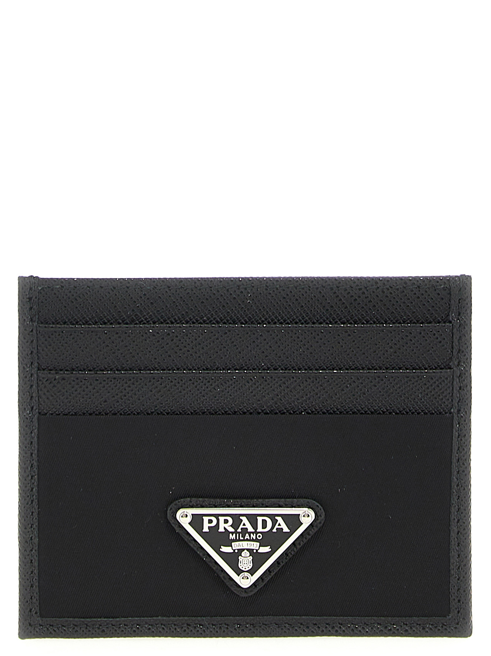 Re-Nylon and Saffiano card holder with triangle logo in enameled metal on the front.