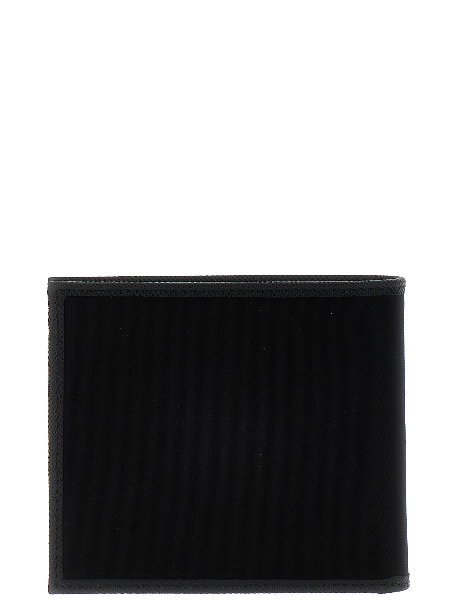 Re-Nylon wallet with enamel metal triangle logo, Saffiano leather details. SUSTAINABLE: This product is made with Re-Nylon, a regenerated yarn sourced from recycled and purified plastic collected in oceans, fishery nets and textile fibers.