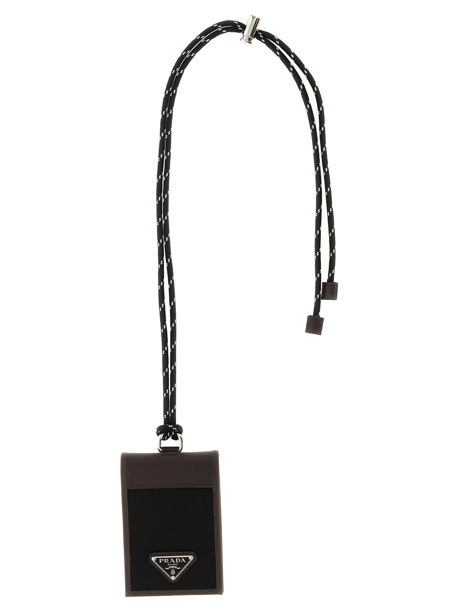 Leather card holder with nylon inserts, book opening, drawstring laces, enamelled metal triangle front logo.