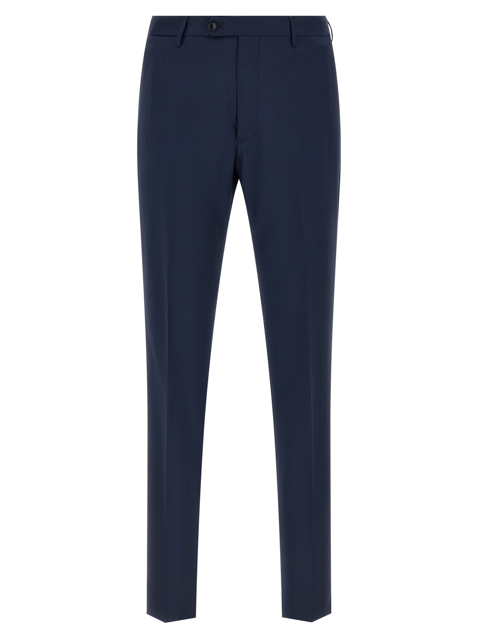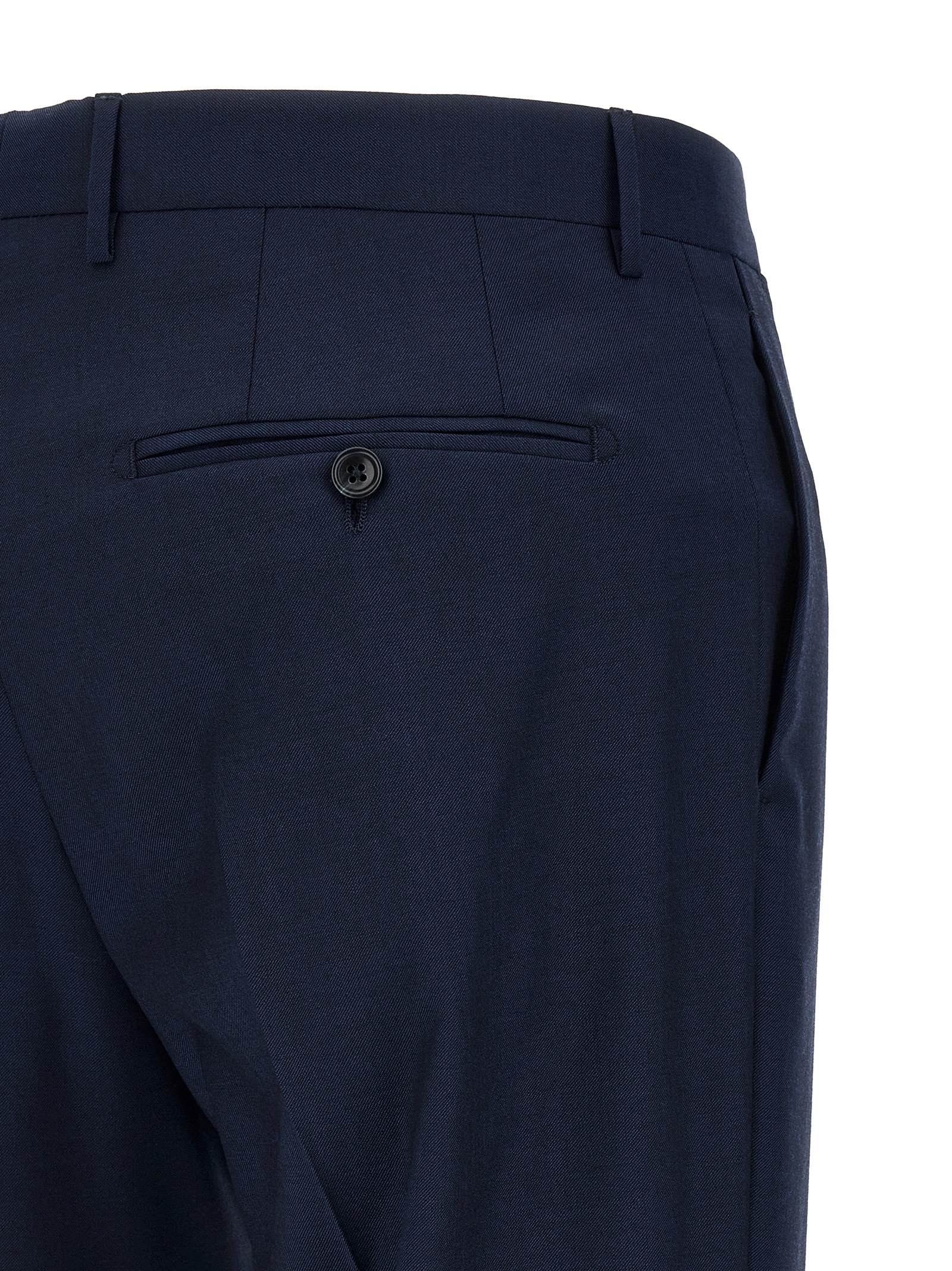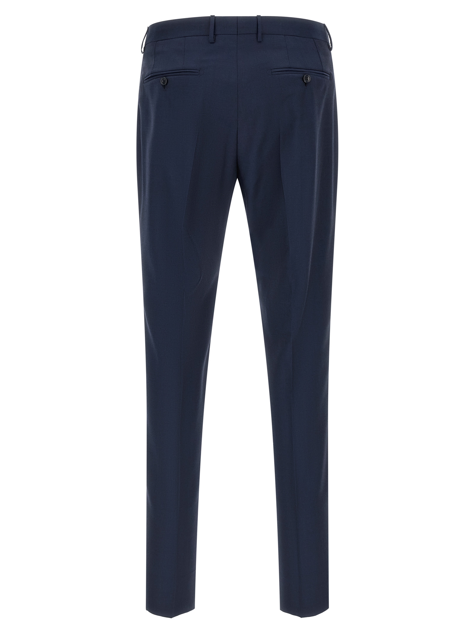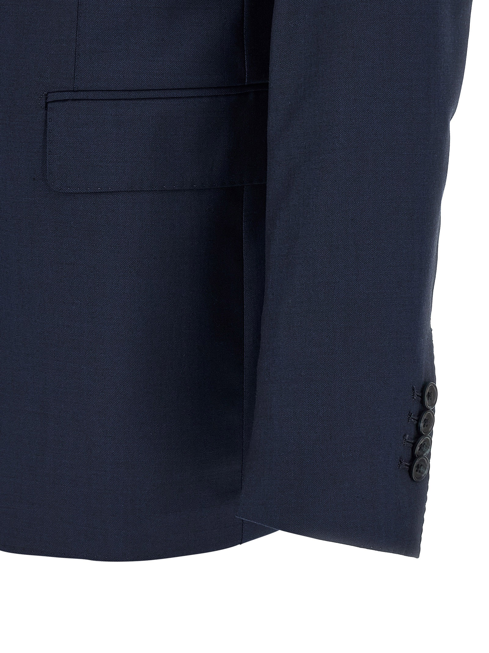 Super 110's virgin wool Montecarlo dress consisting of single-breasted deconstructed blazer with front horn button closure, tooth lapels with removable metal pin, breast pocket, flap pockets, cupro half-lining, three inner pockets, buttonhole cuffs, back slits and trousers with pressed crease, front 'americane pockets', back welt pockets, front zip and button closure, cotton lining, leg bottoms with hem to be finished.