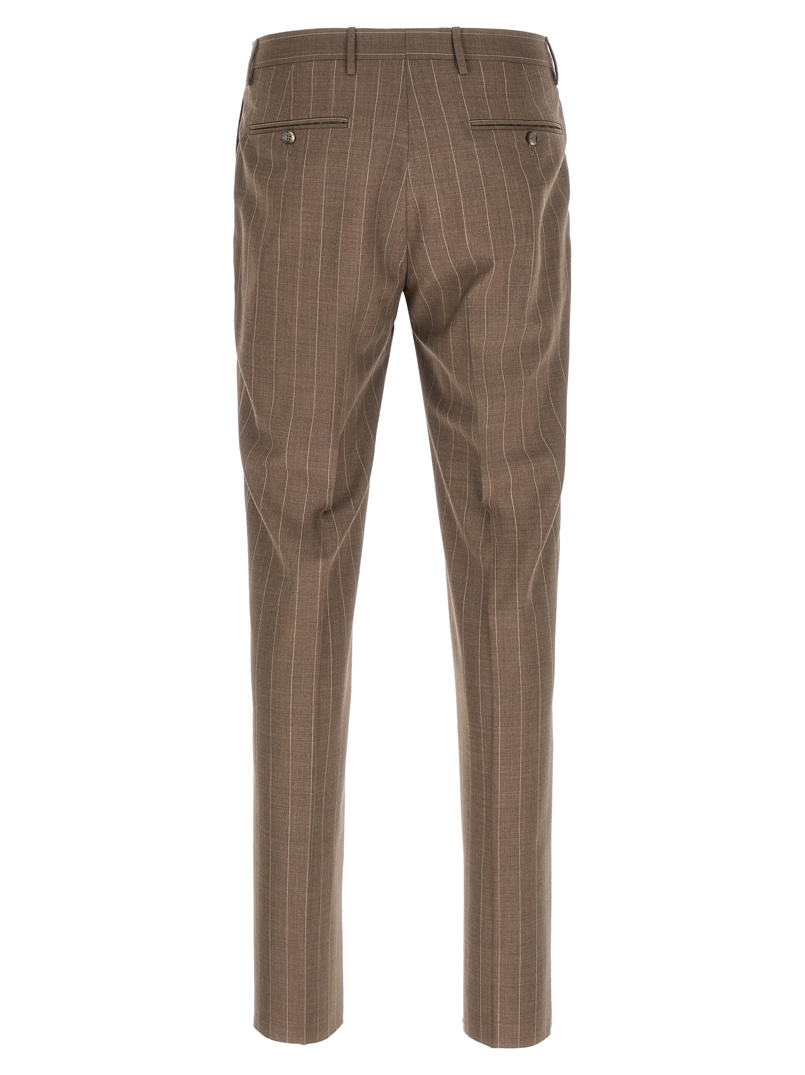 Super 130's pinstriped virgin wool dress Vesuvio consisting of double-breasted blazer with front button closure, peak lapels with removable metal pin, breast pocket, flap pockets, cupro lining, four inner pockets, cuffs with open buttonholes, back slits and trousers with stretched pleat, front 'americane pockets', back welt pockets, front zip and button closure, cotton lining.