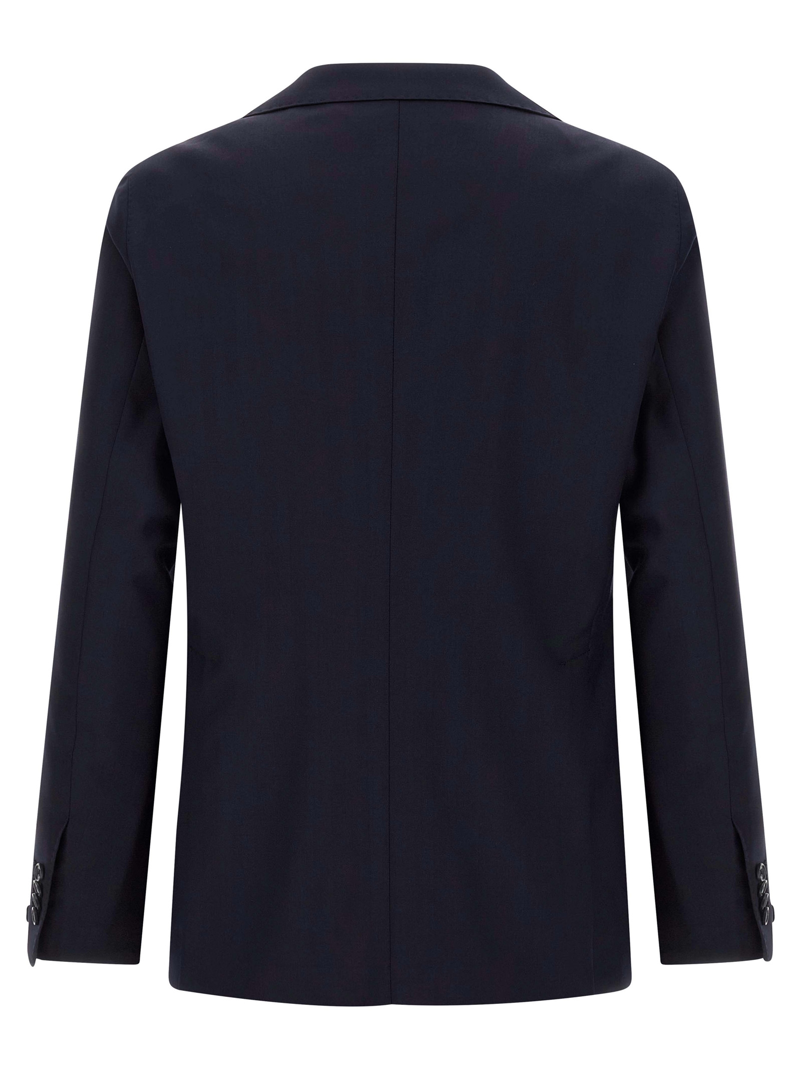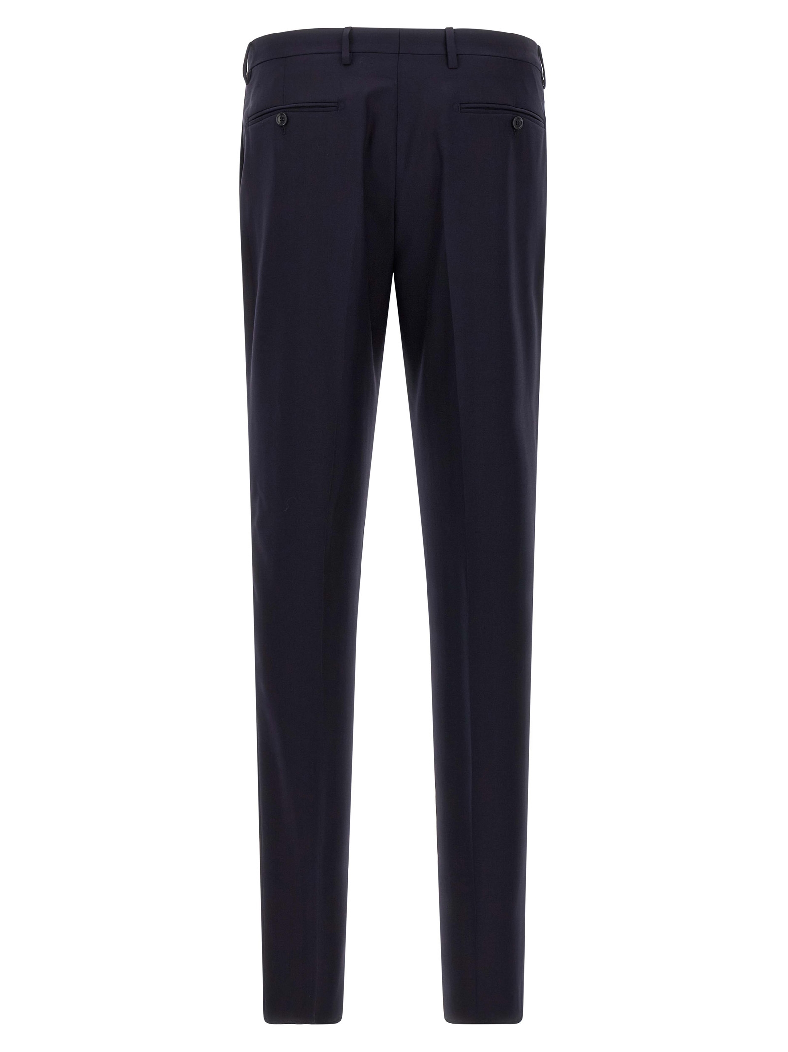 Vesuvio Super 110's super 110's tone-on-tone striped wool dress consisting of single-breasted blazer with front button closure, mirror lapels with removable metal brooch, semi-lined, breast pocket, flap pockets, buttonhole cuffs, back slits and regular flat front pants, stretched pleat, front 'americane pockets', back welt pockets, zip closure and front buttons.