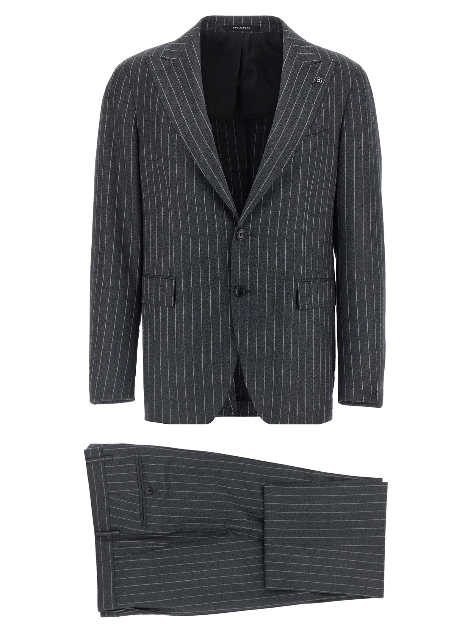 Super 120's pinstripe virgin wool dress consisting of single-breasted blazer with front button closure, peak lapels with removable metal brooch, breast pocket, flap pockets, cuffs with open buttonholes, back vents, unlined and trousers with stretched pleat, front zip and button closure, pockets.