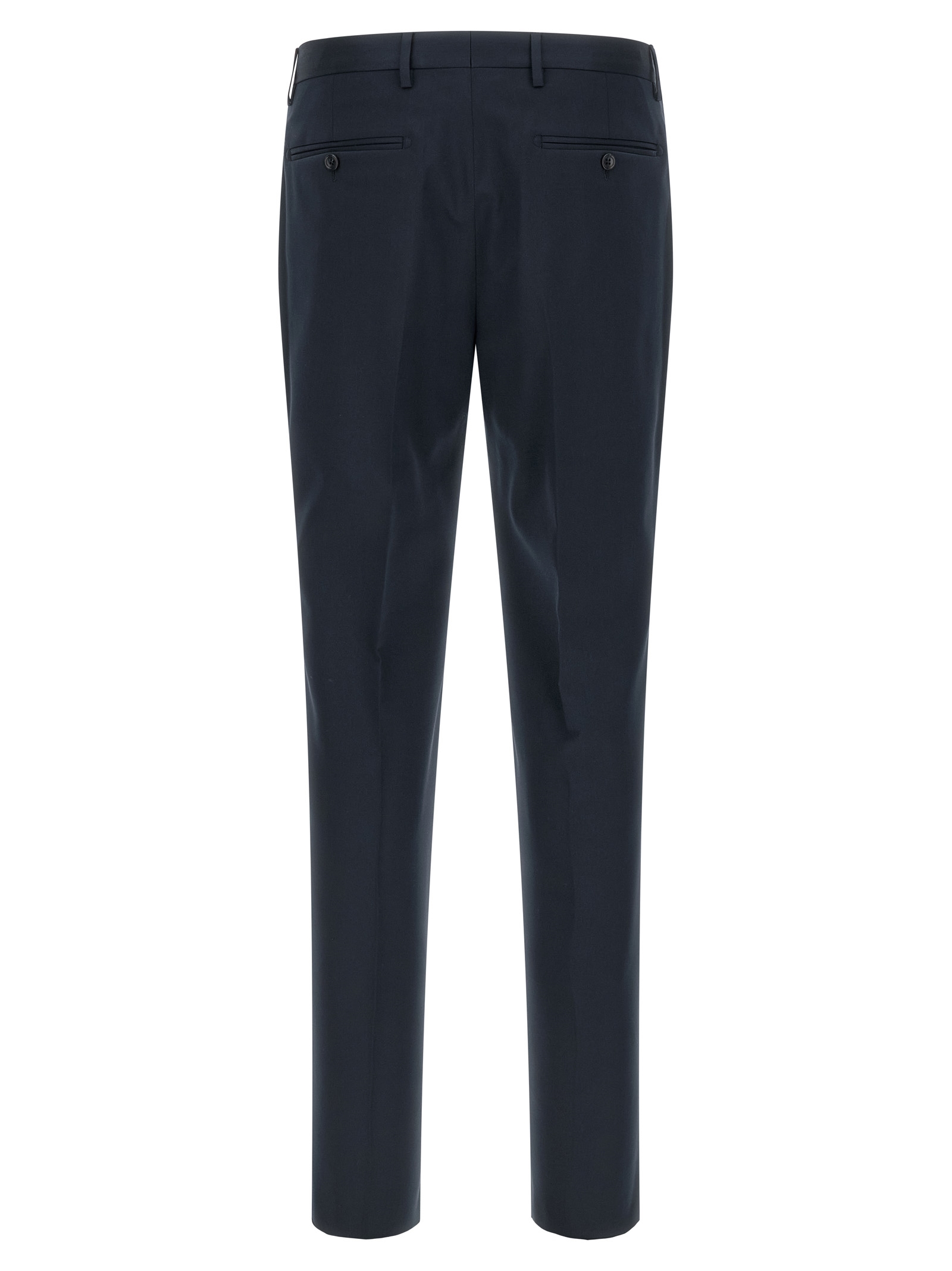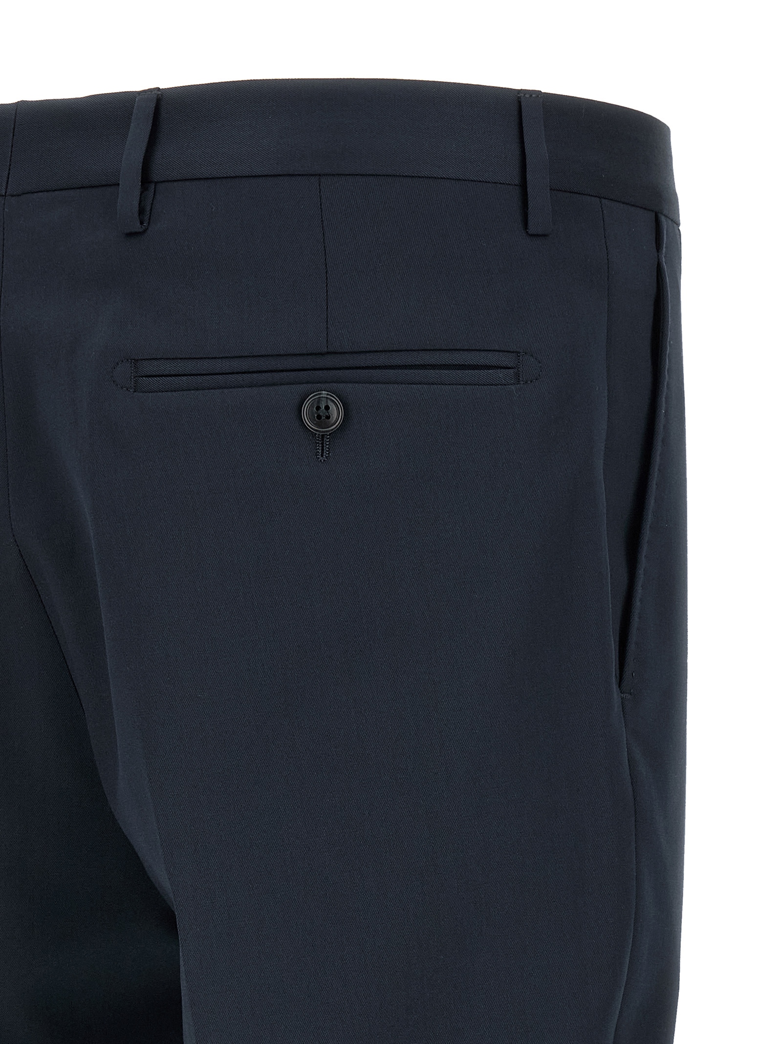 'Vesuvio' virgin wool and cotton blend dress consisting of single-breasted blazer with front button closure, peak lapels with removable metal brooch, breast pocket, flap pockets, cupro lining, two inner pockets, cuffs with open buttonholes, back slits and trousers with stretched pleat, front 'americane pockets', back welt pockets, front zip and button closure, cotton lining.