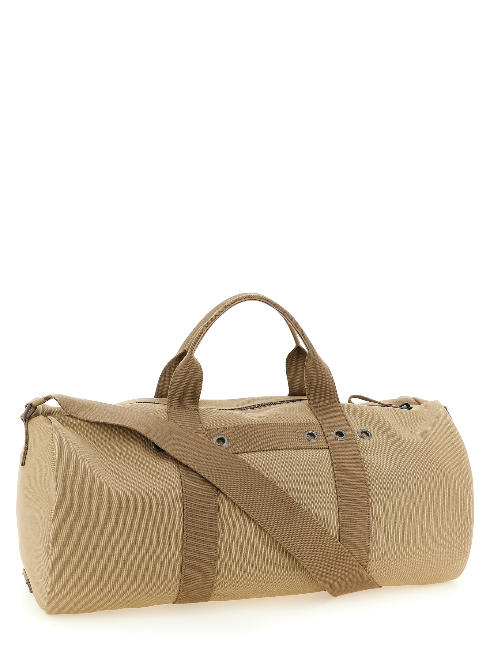 Canvas travel bag with cotton and metal ribbon details, utility-inspired design, front embossed logo, side enameled metal triangle, double handle, top zip closure, canvas lining, adjustable shoulder strap.