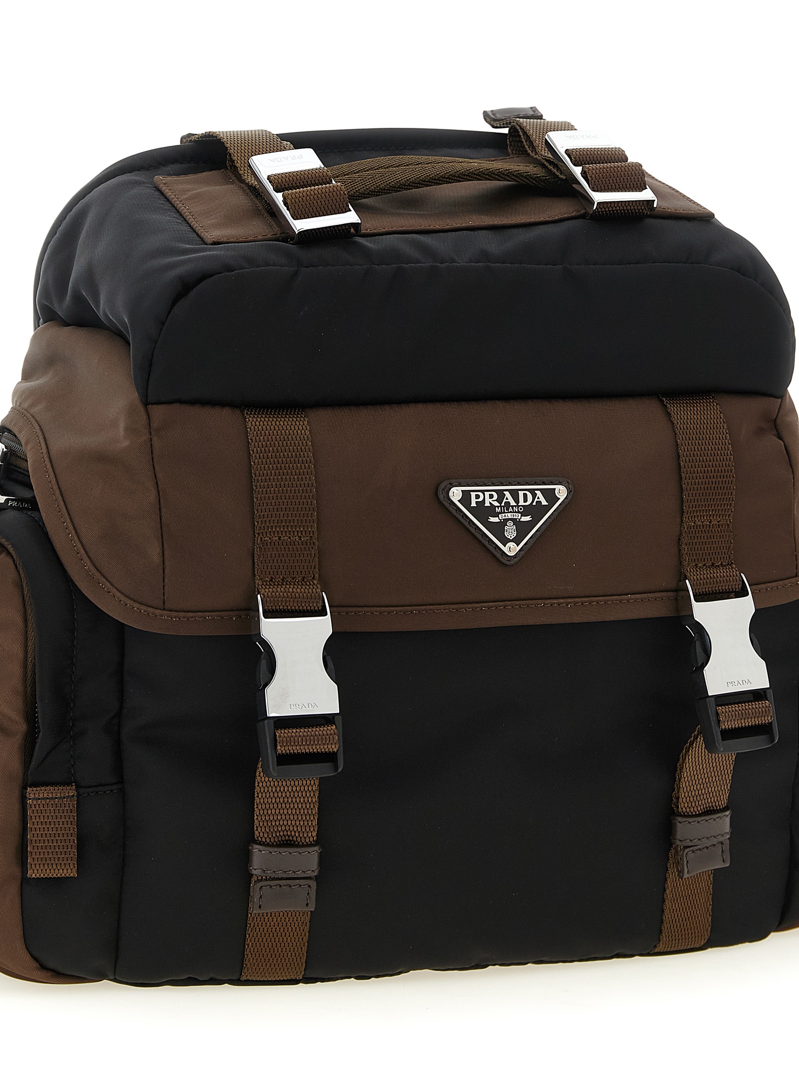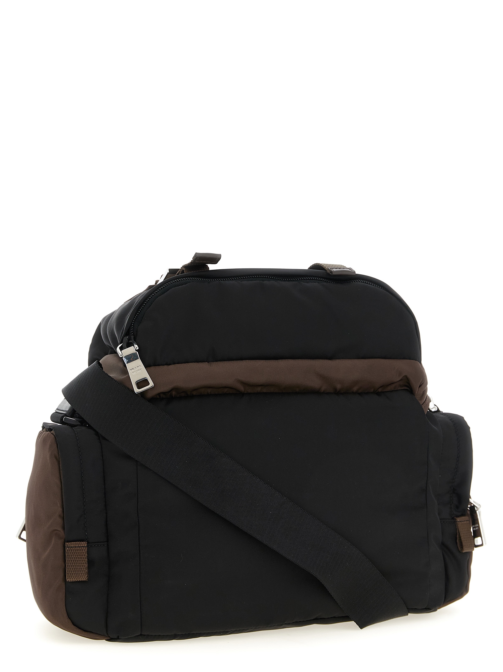 Re-Nylon crossbody bag with leather details, multi-pocket style, flap closure with adjustable tuc and front enameled metal triangle logo, padded nylon ribbon handle, Re-Nylon lining, an inner pocket, adjustable logo tape shoulder strap. SUSTAINABLE: This product is made with Re-Nylon, a regenerated yarn made from recycled and purified plastic collected in oceans, fishery nets and textile fibers.