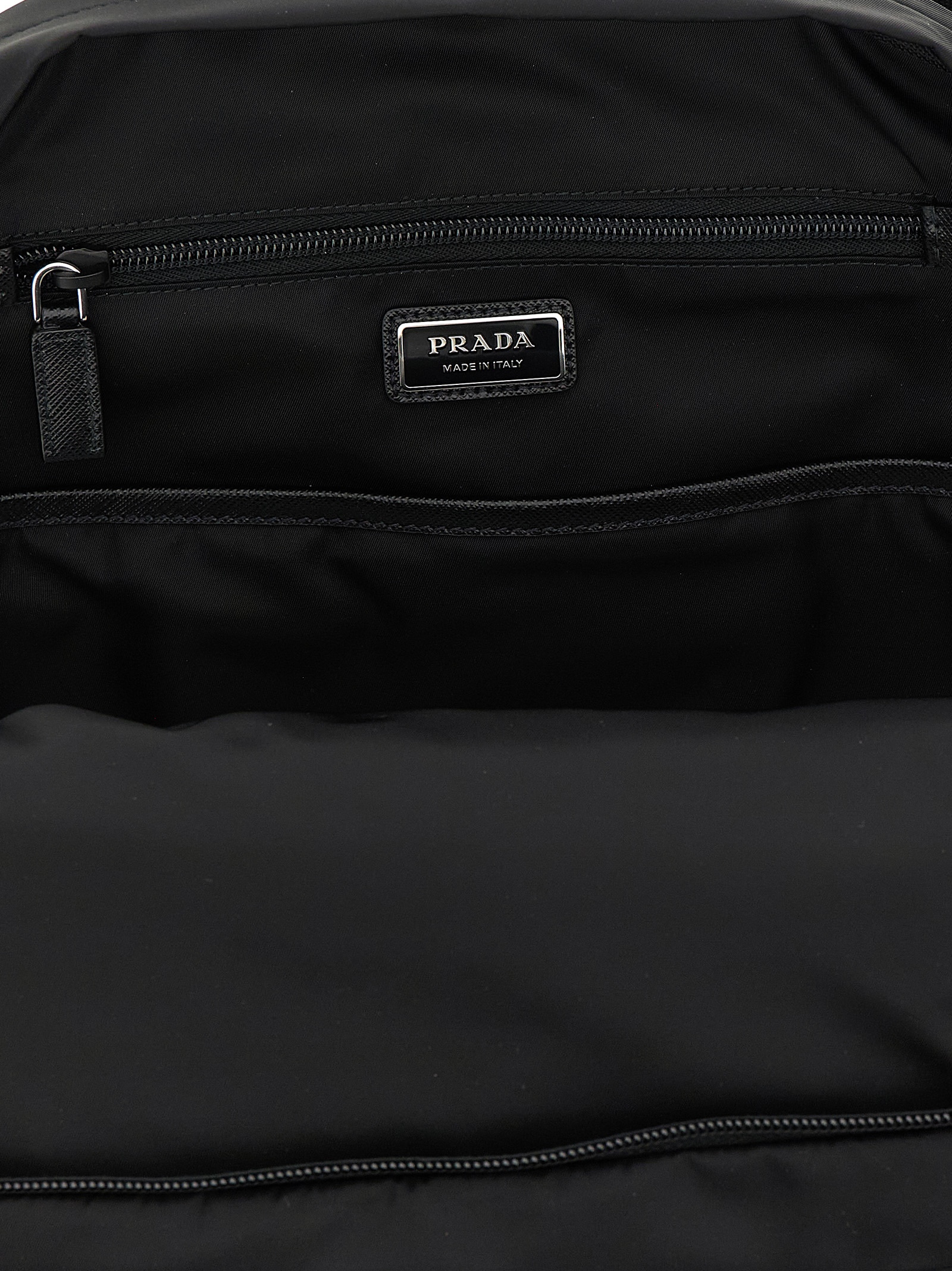 Re-Nylon backpack with Saffiano details, adjustable padded nylon tape shoulder straps, front triangle logo, zip closure, outer zip pockets, padded back mesh fabric. SUSTAINABLE: This product is made with Re-Nylon, a regenerated yarn sourced from recycled and purified plastic collected in oceans, fishery nets and textile fibers.