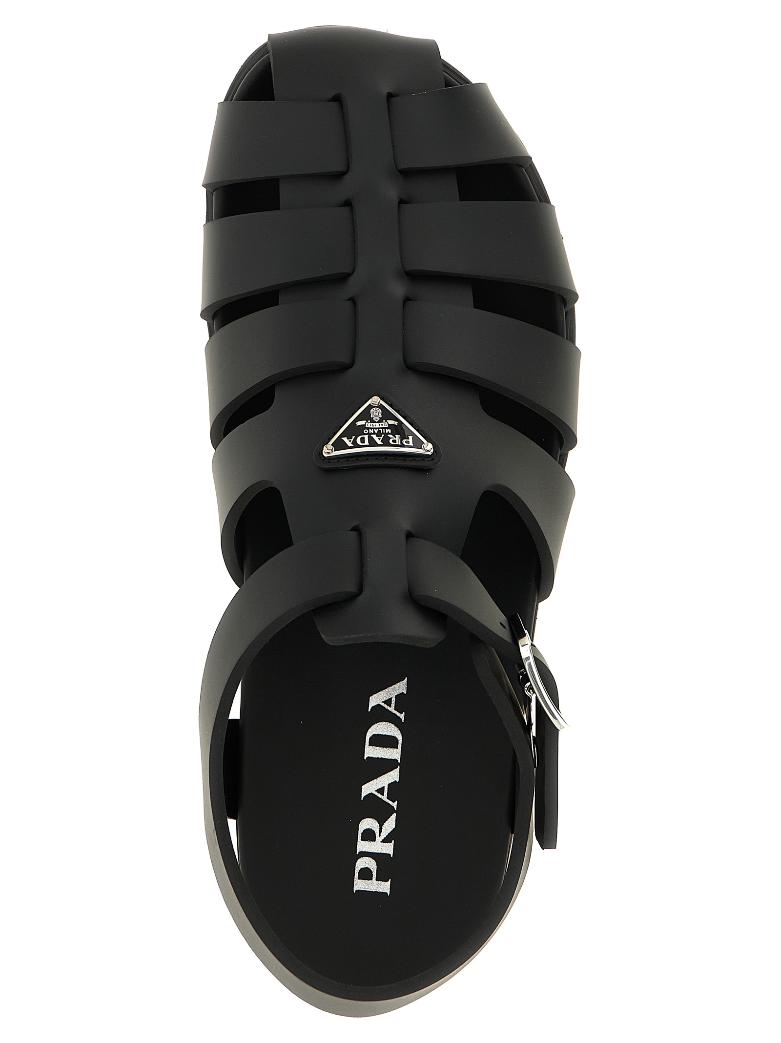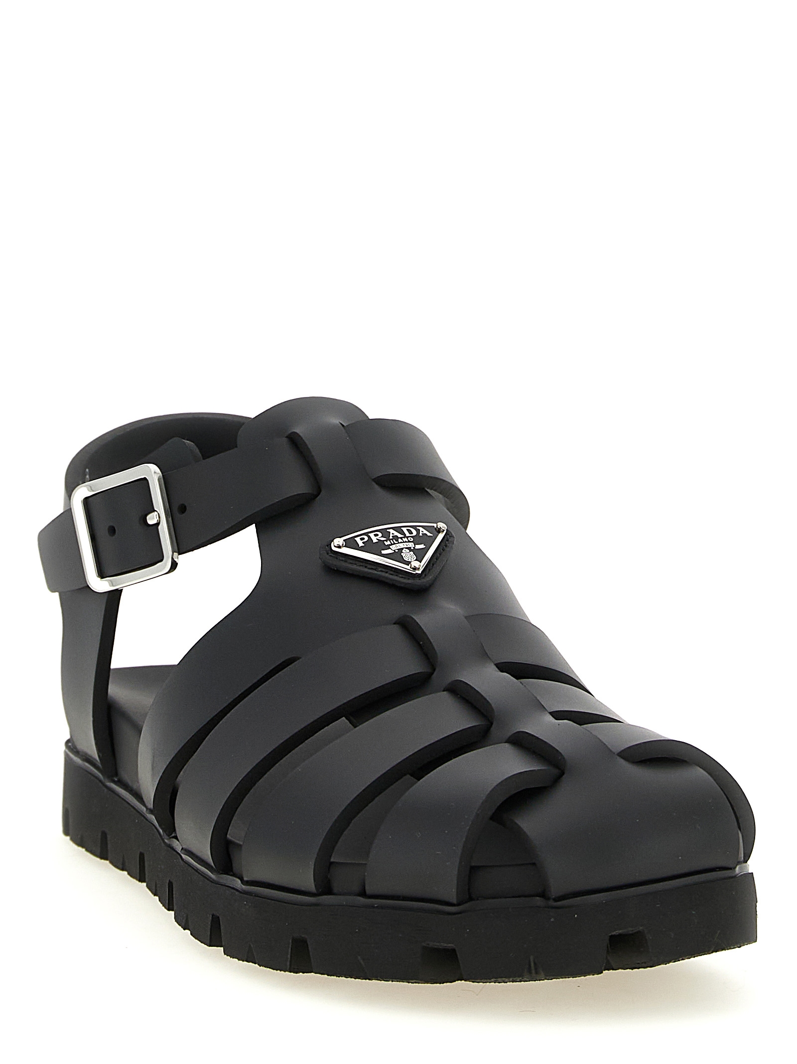 Rubber sandals, cage design, triangle logo in enameled metal on the front, wrapped leather insole, adjustable strap, rubber sole with notched tread.Характеристики товара