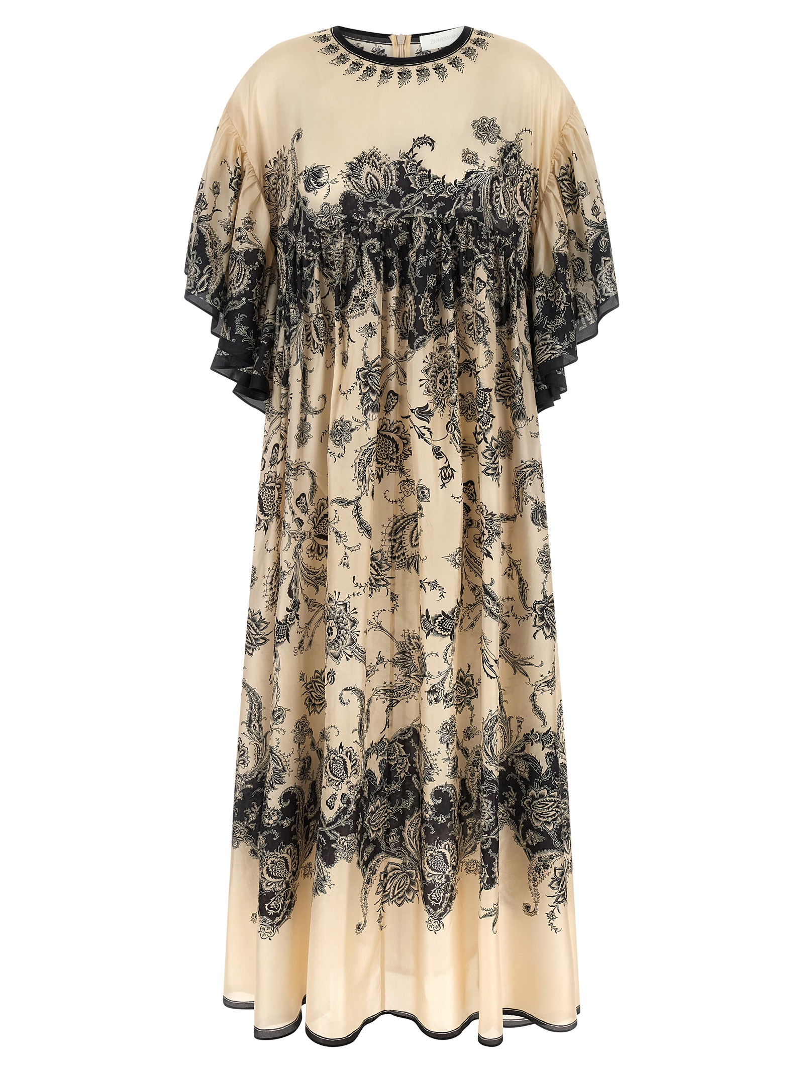 'Rhiannon Maxi' floral patterned habotai silk dress, crew neck, voluminous curl under the bodice, short sleeves with ruffle cuffs, pockets, back zip closure.