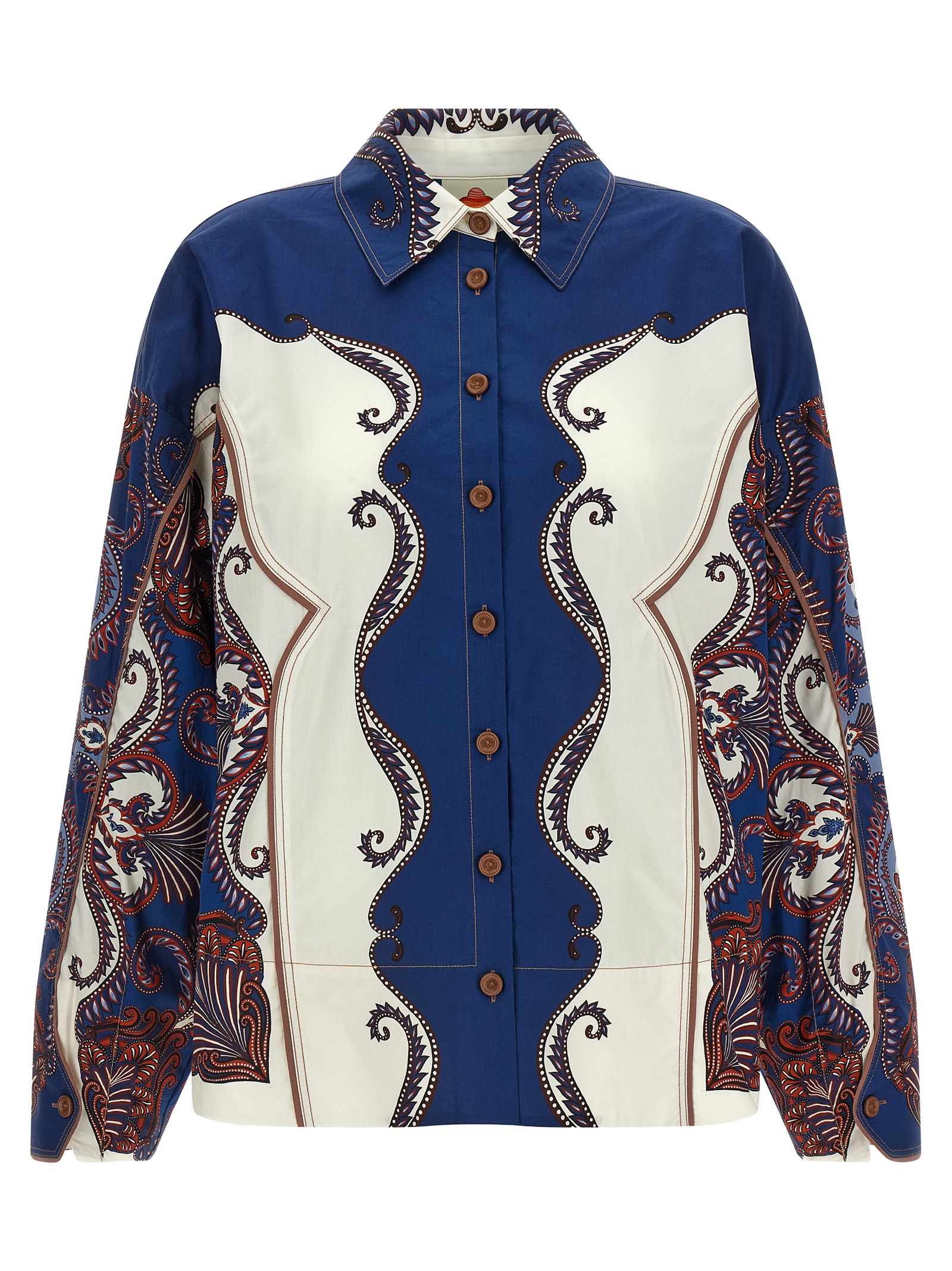 Шарф «Арабеска», хлопковая рубашка Sand с принтом по всей поверхности, прямого кроя, заостренным воротником, застежкой на пуговицы спереди, декоративной строчкой и вставками по длине, асимметричным низом и высоким краем по низу из двойной ткани.