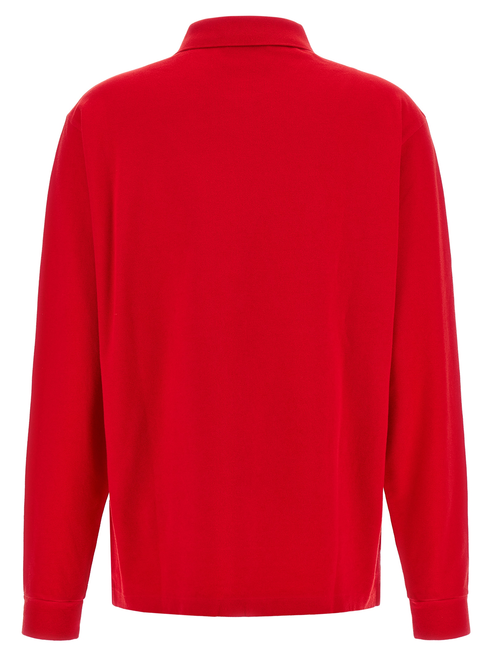 Used-effect garment-dyed cotton piquet polo shirt, front welt logo embroidery, deep V-neck collar and buttons, long sleeves with cuffs and dropped shoulder, side slits, and asymmetrical hem.