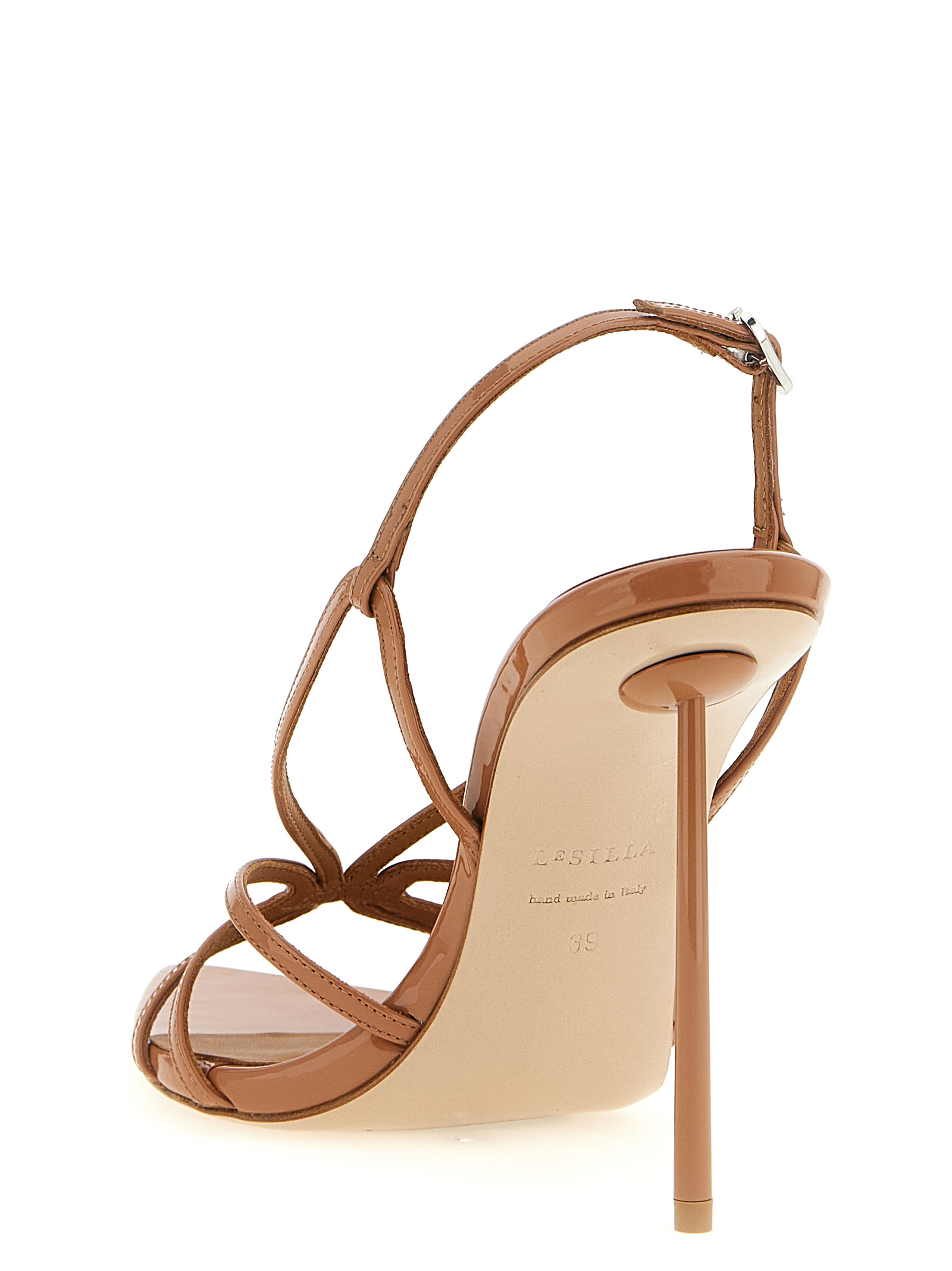 'Eugenie' patent calf leather sandals with pointed toe, adjustable ankle strap, stiletto heel, leather sole.