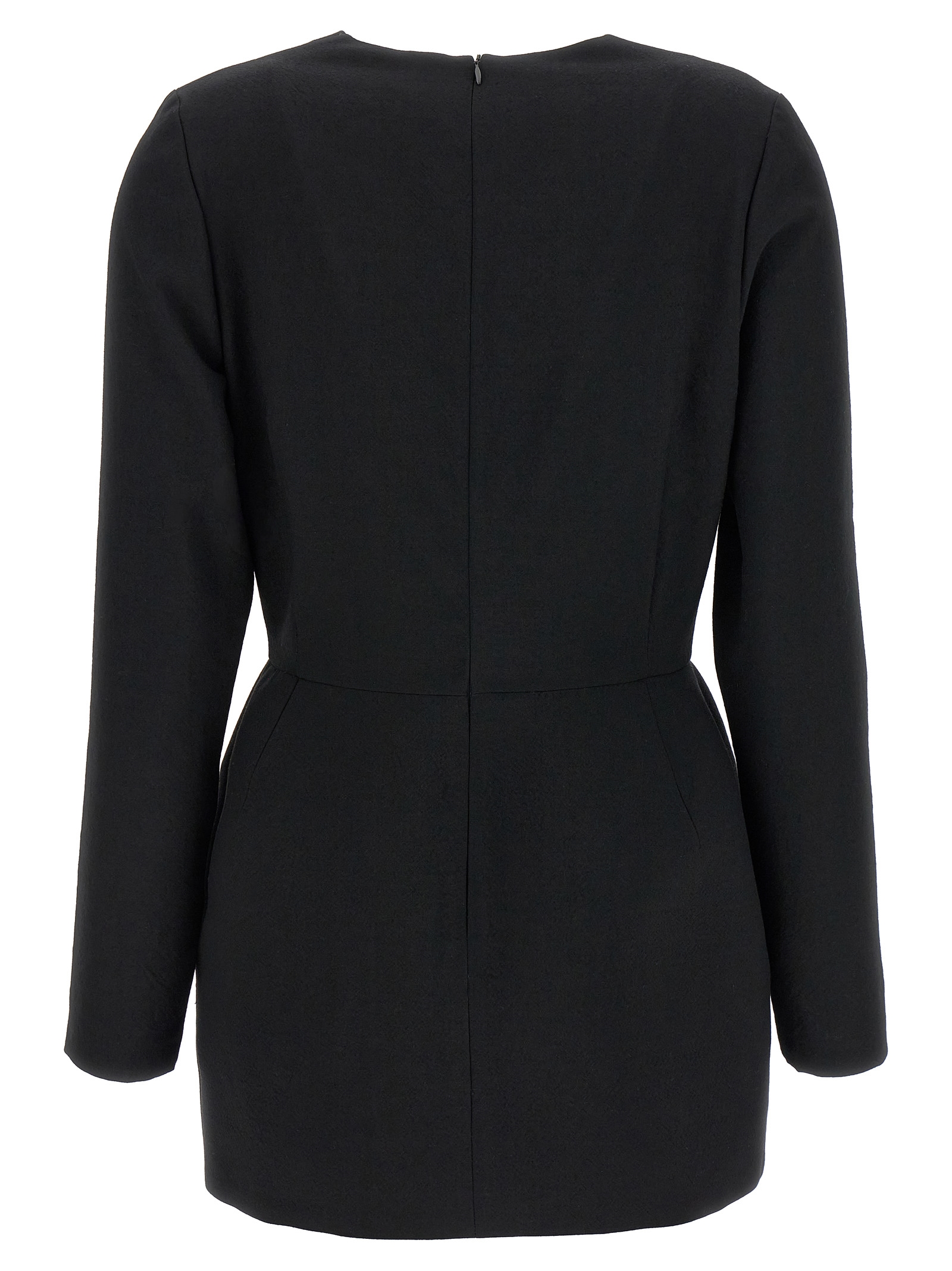 Мини-платье из шерсти, размер 37, с шелковой подкладкой, глубоким V-образным вырезом и объемной цветочной аппликацией на талии, длинными рукавами, структурированной юбкой по бокам, застежкой-молнией сзади.