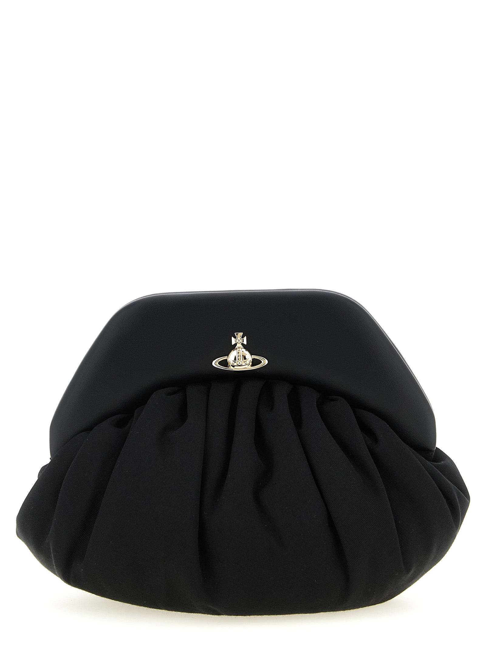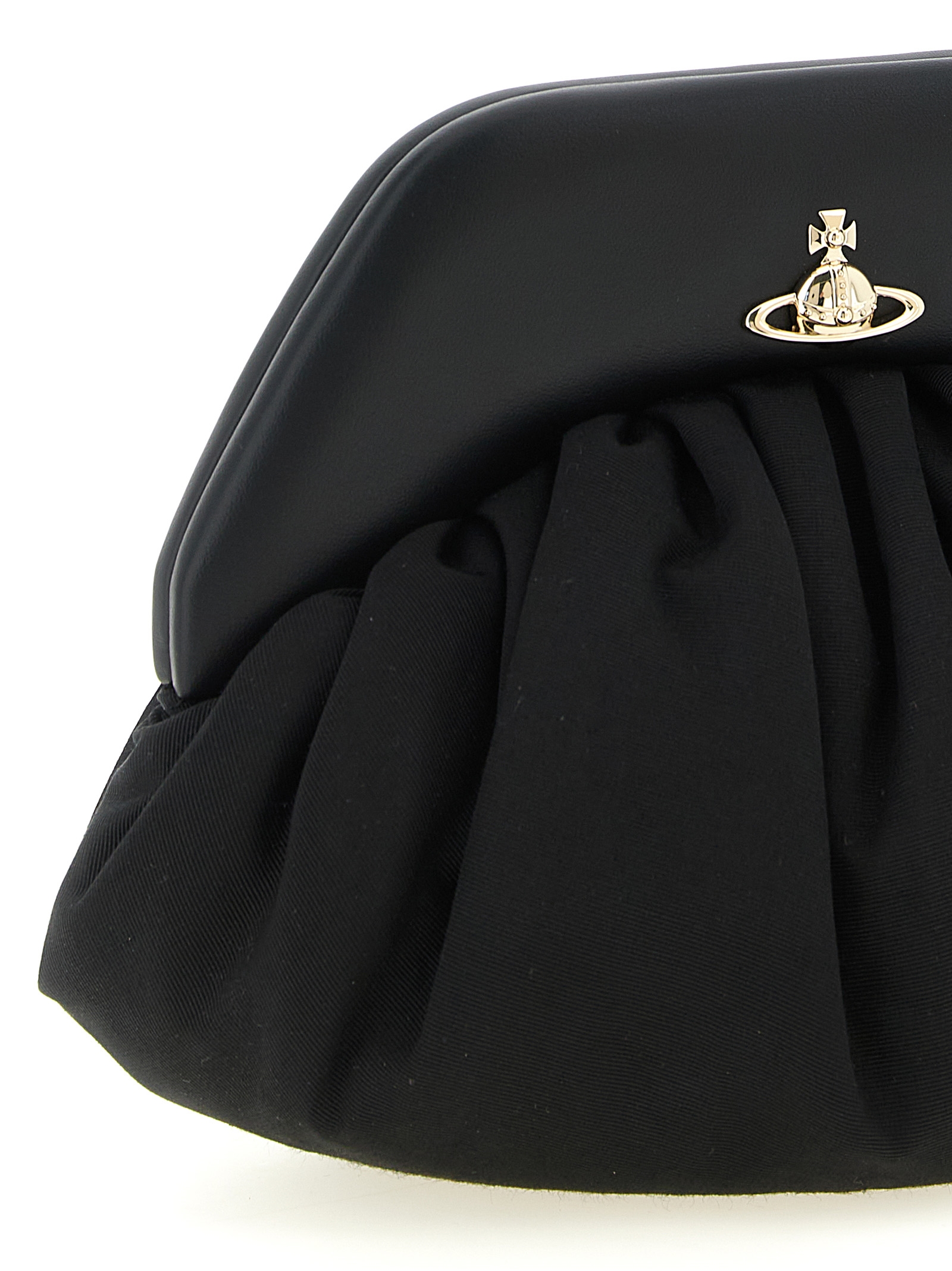 'Brooke' crinkled fabric clutch, magnetic closure with outer leather-effect fabric and metal acting as an inner mirror, metal Orb logo on the front, removable 'Hazel' handle.