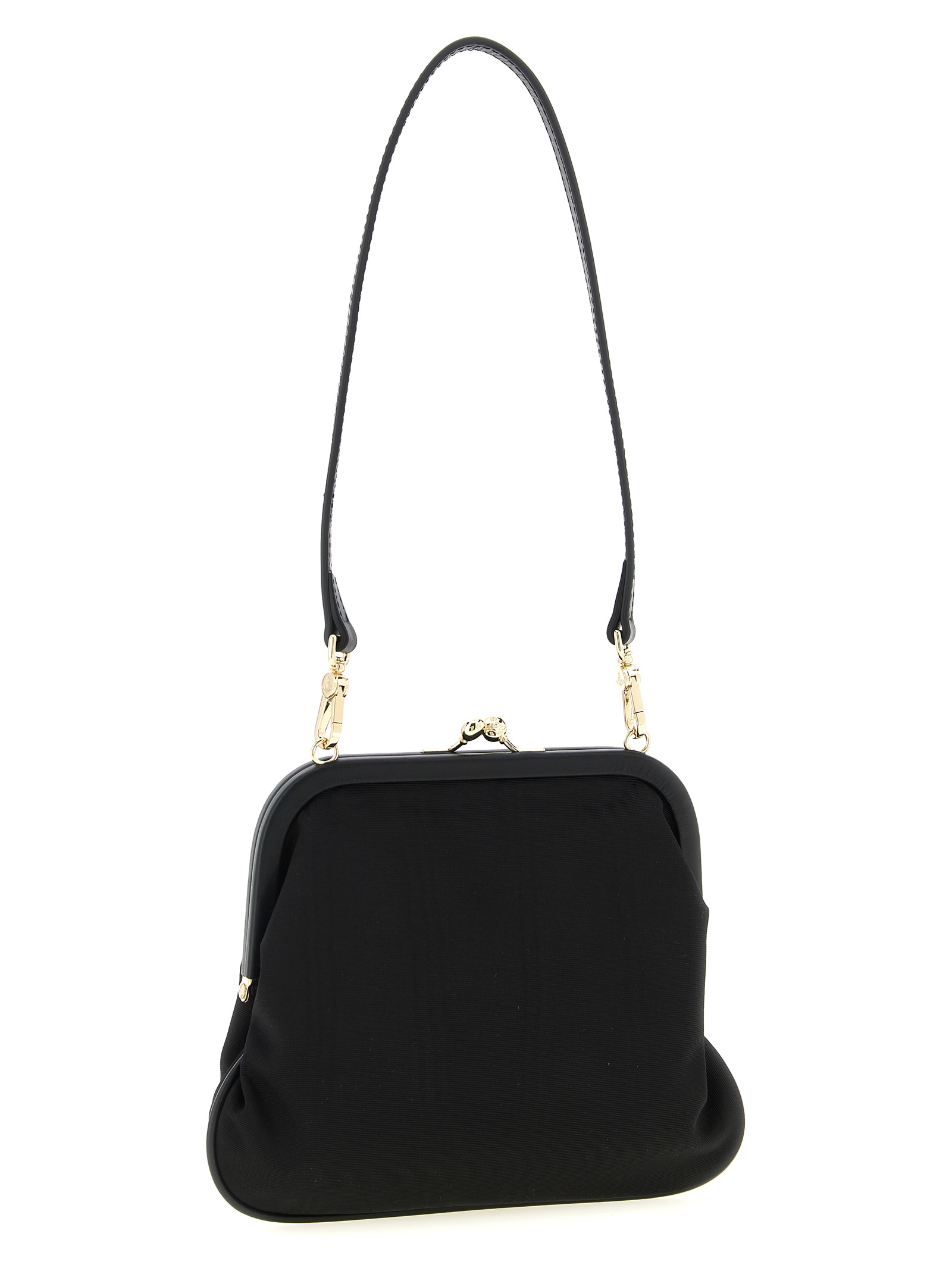 'Vivienne' tulle-effect fabric clutch with leather-effect fabric details, front metal 'Orb Bas Relief' logo, snap closure, removable handle.