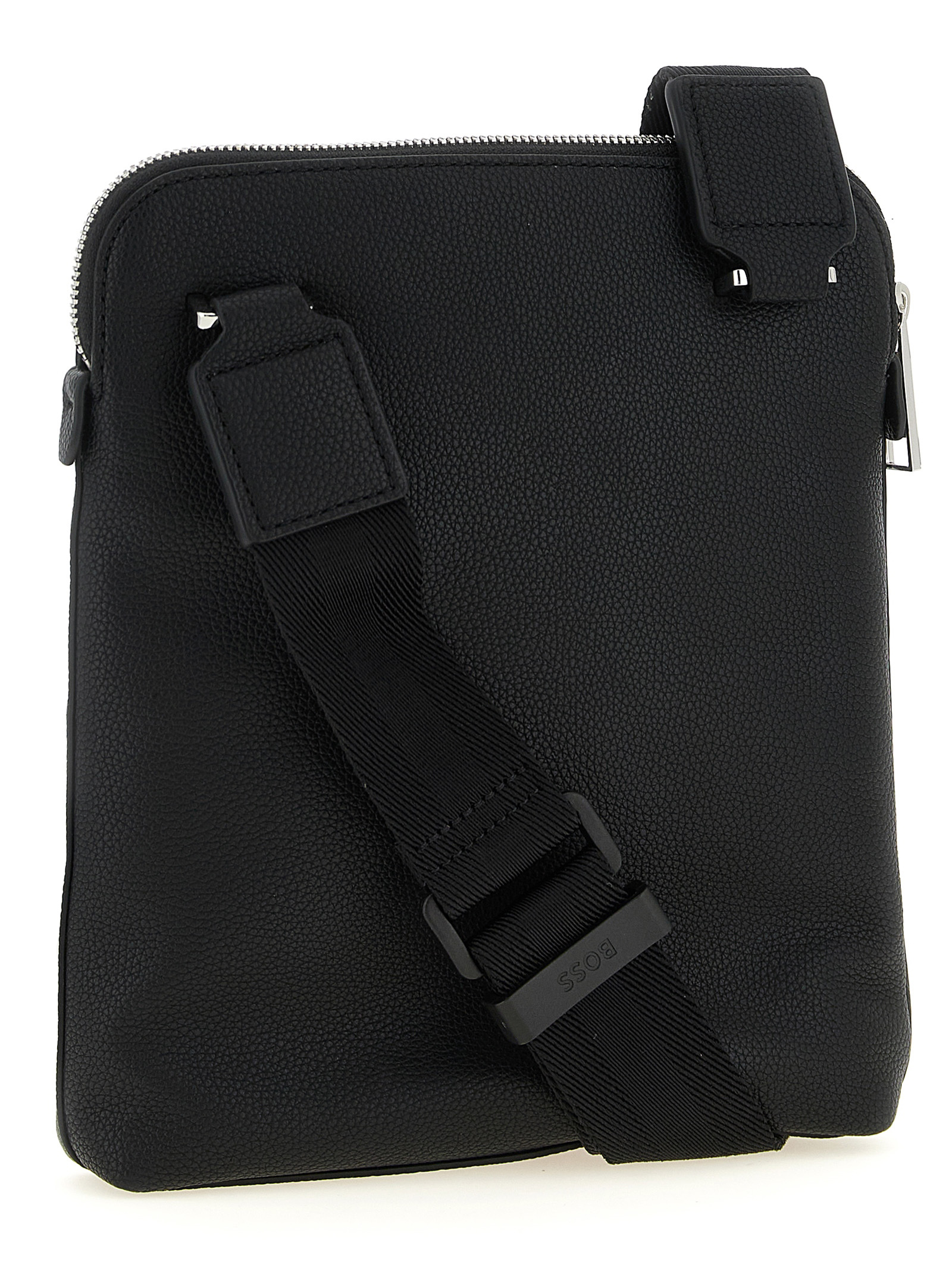 'Ray_S' crossbody bag in hammered leather-effect fabric, embossed logo and front zip pocket, top zip closure, adjustable fabric shoulder strap.