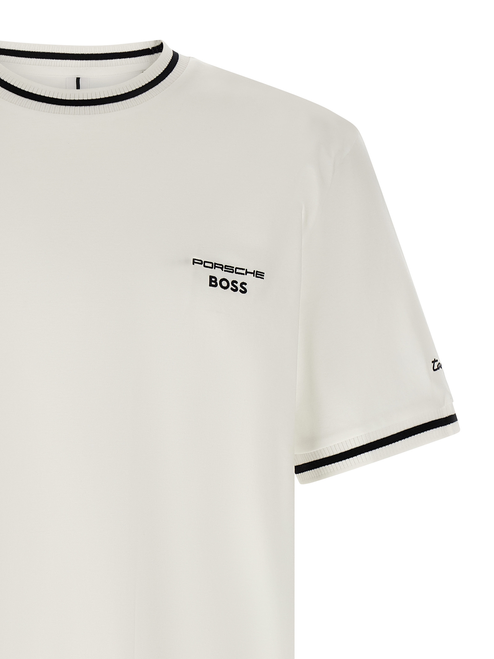 Porsche x BOSS 'C-Taut 197' mercerized cotton T-shirt with knit details, front logo embroidery, short sleeves with cuffs and embroidery, side vents.