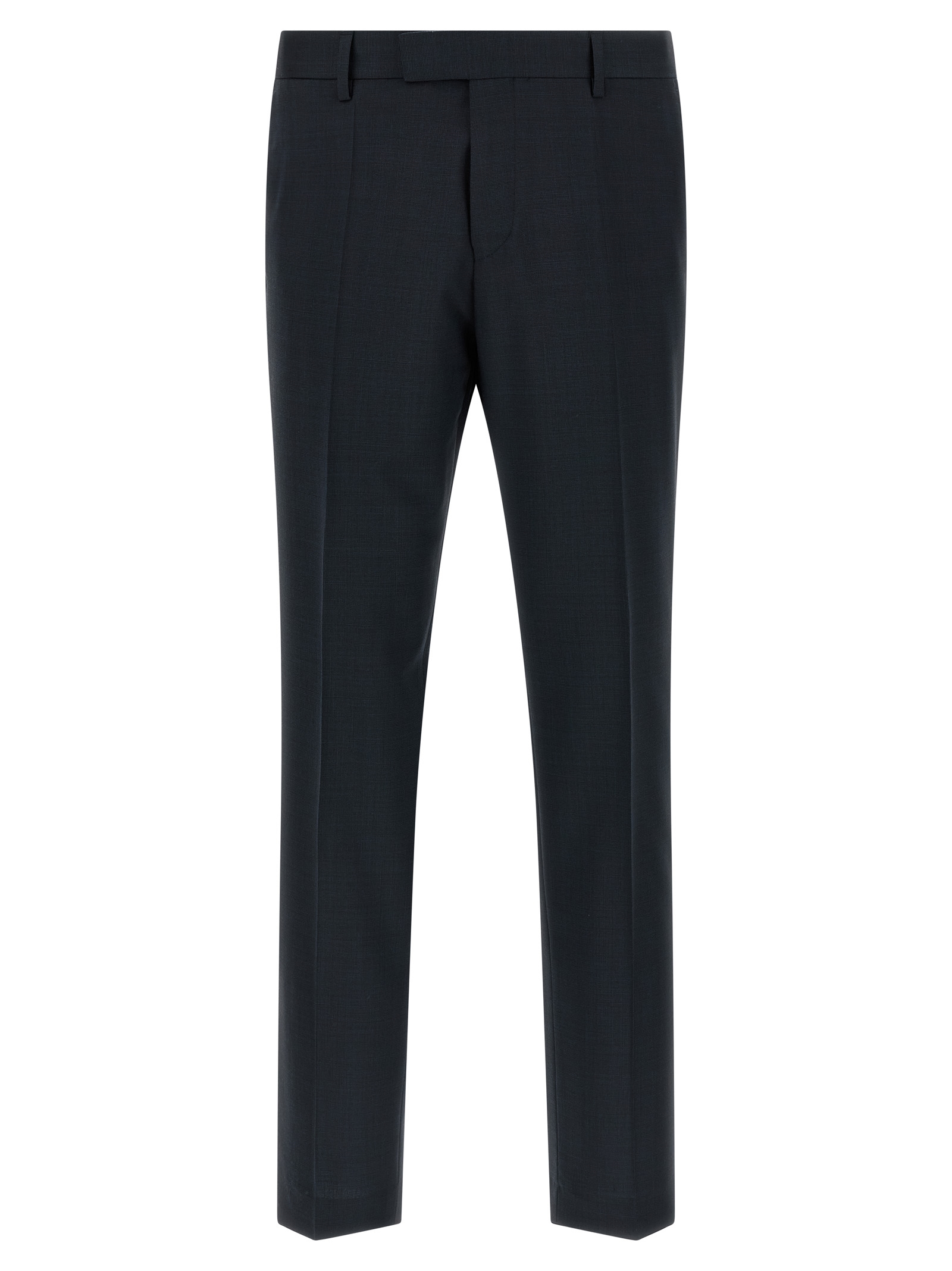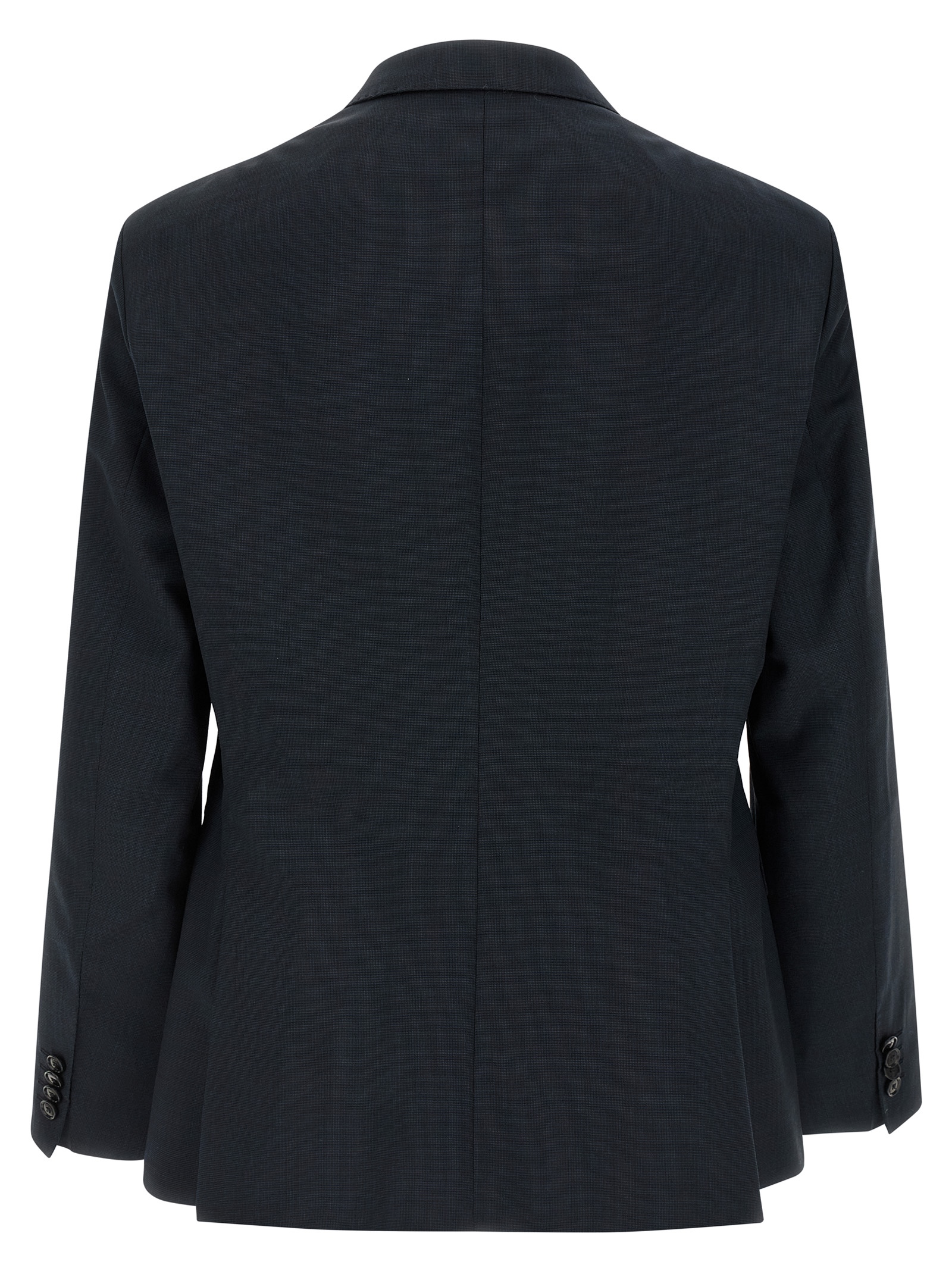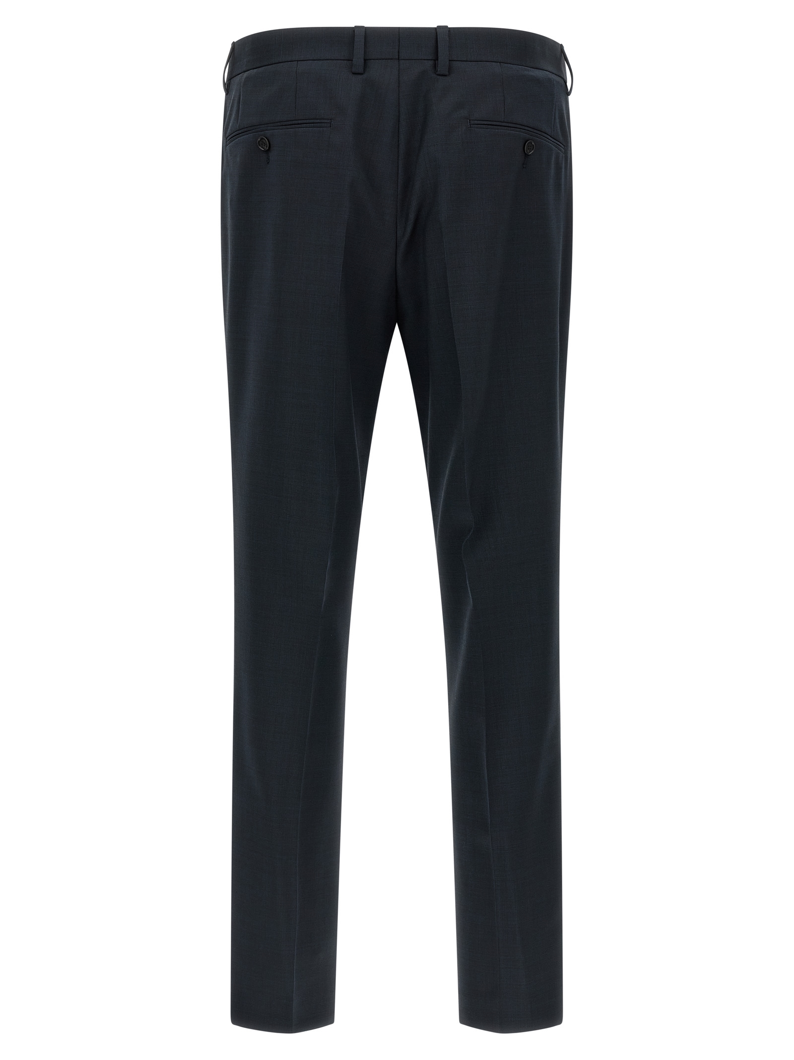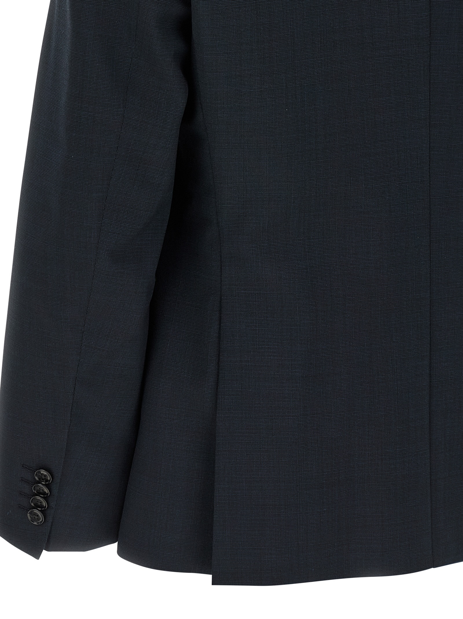 'Huge' dress - Micro texture virgin wool 'Marzotto' line consisting of single-breasted blazer with front two-button closure, mirror lapels, breast pocket, flap pockets, structured shoulder strap, buttonhole cuffs, back vents, monogram lining, two inner pockets and stretched pleat trousers, front pockets' americane', back welt pockets, front zip and hook closure, viscose lining.