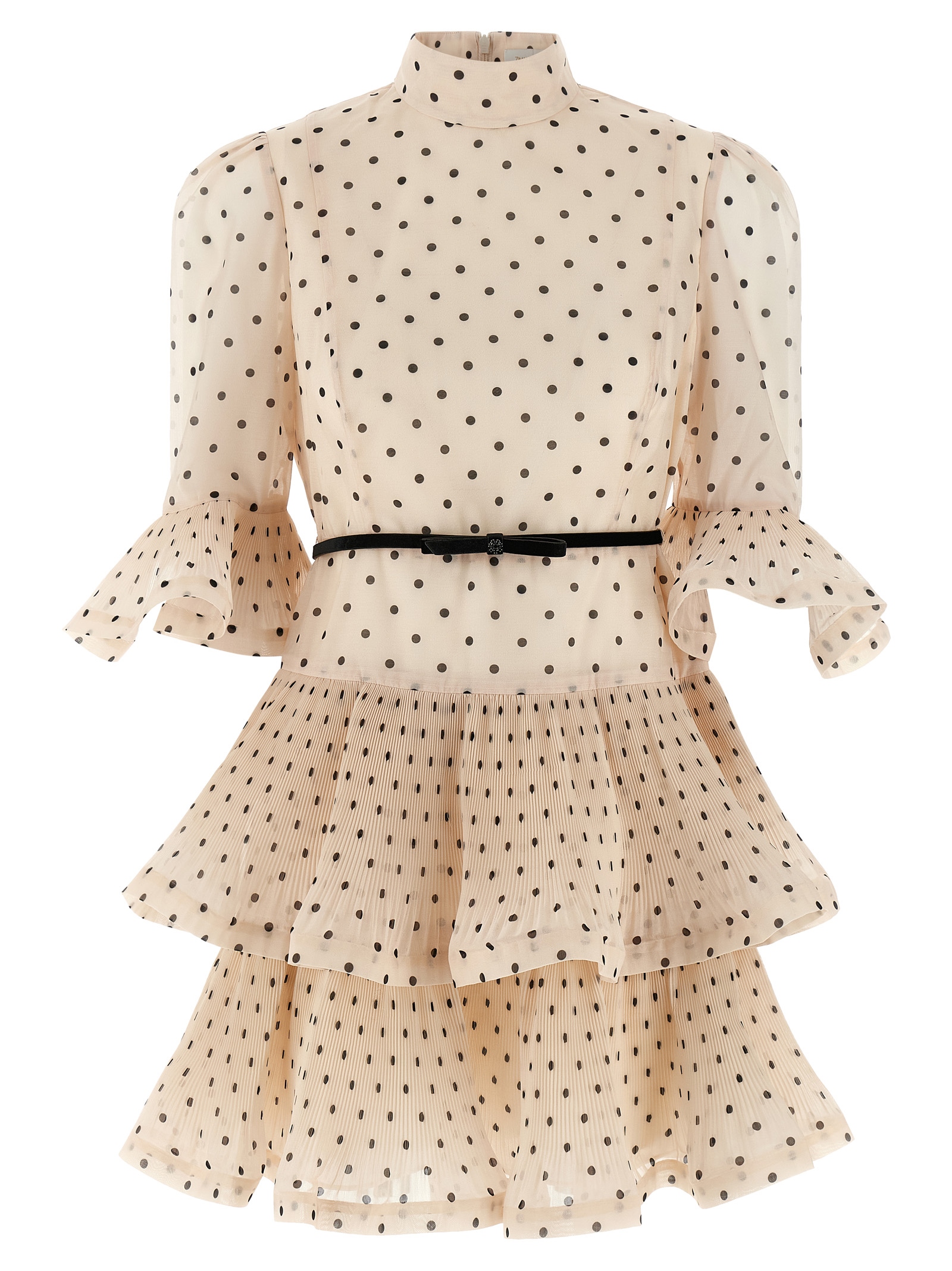 Мини-платье с плиссированными рукавами из полупрозрачной ткани с принтом в горошек по всей поверхности, высоким воротником, застежкой-молнией сзади, двойным поясом на талии, плиссированными вставками на юбке и по низу рукавов.Характеристики товара