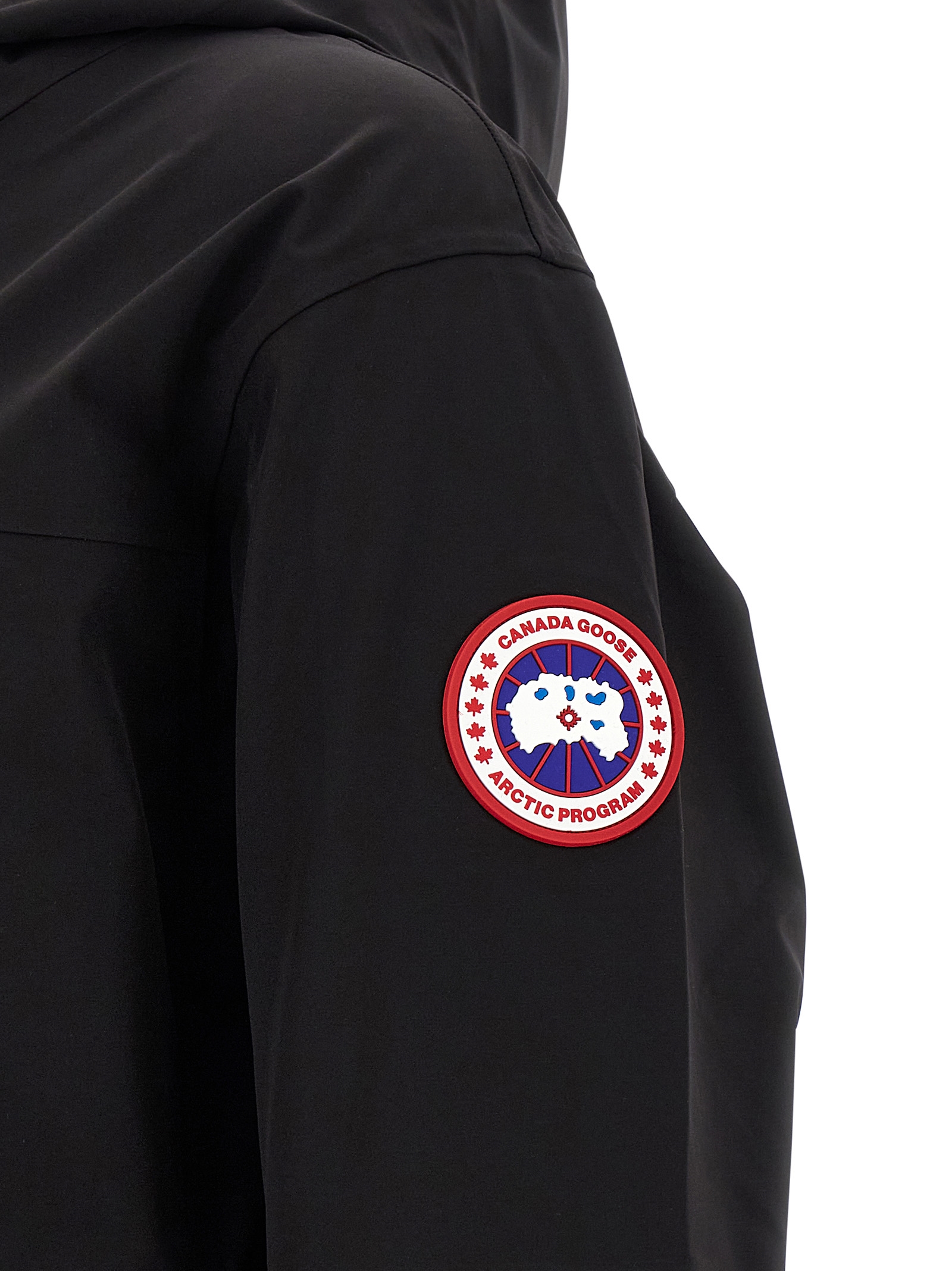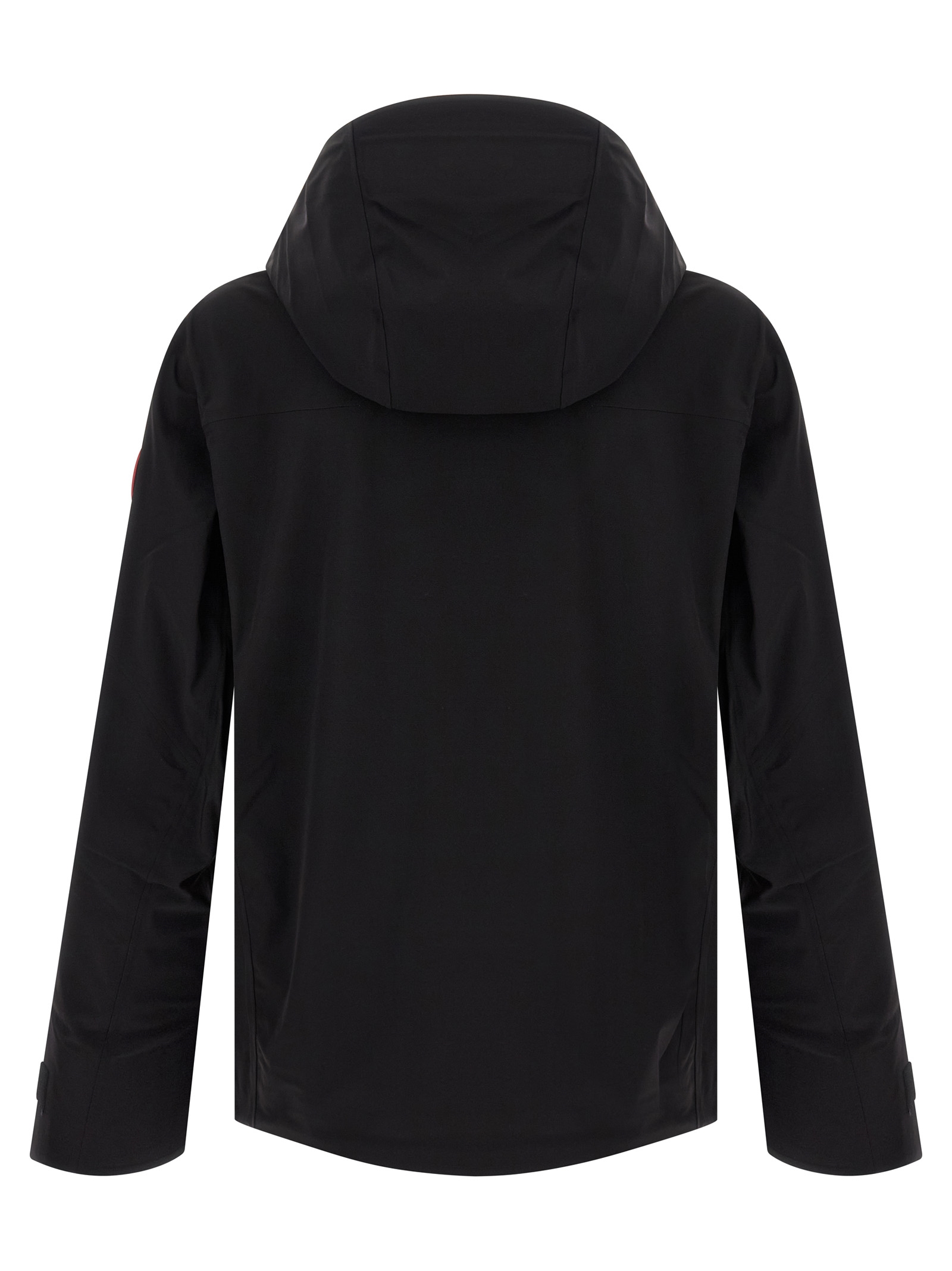 'Rupert' waterproof three-layer flexible fabric rain jacket with fully heat-sealed seams, adjustable hood, ventilation under the arms, front zip and snap button closure, pockets, long sleeves with silicone logo patch, drawstring at the hem, unlined.