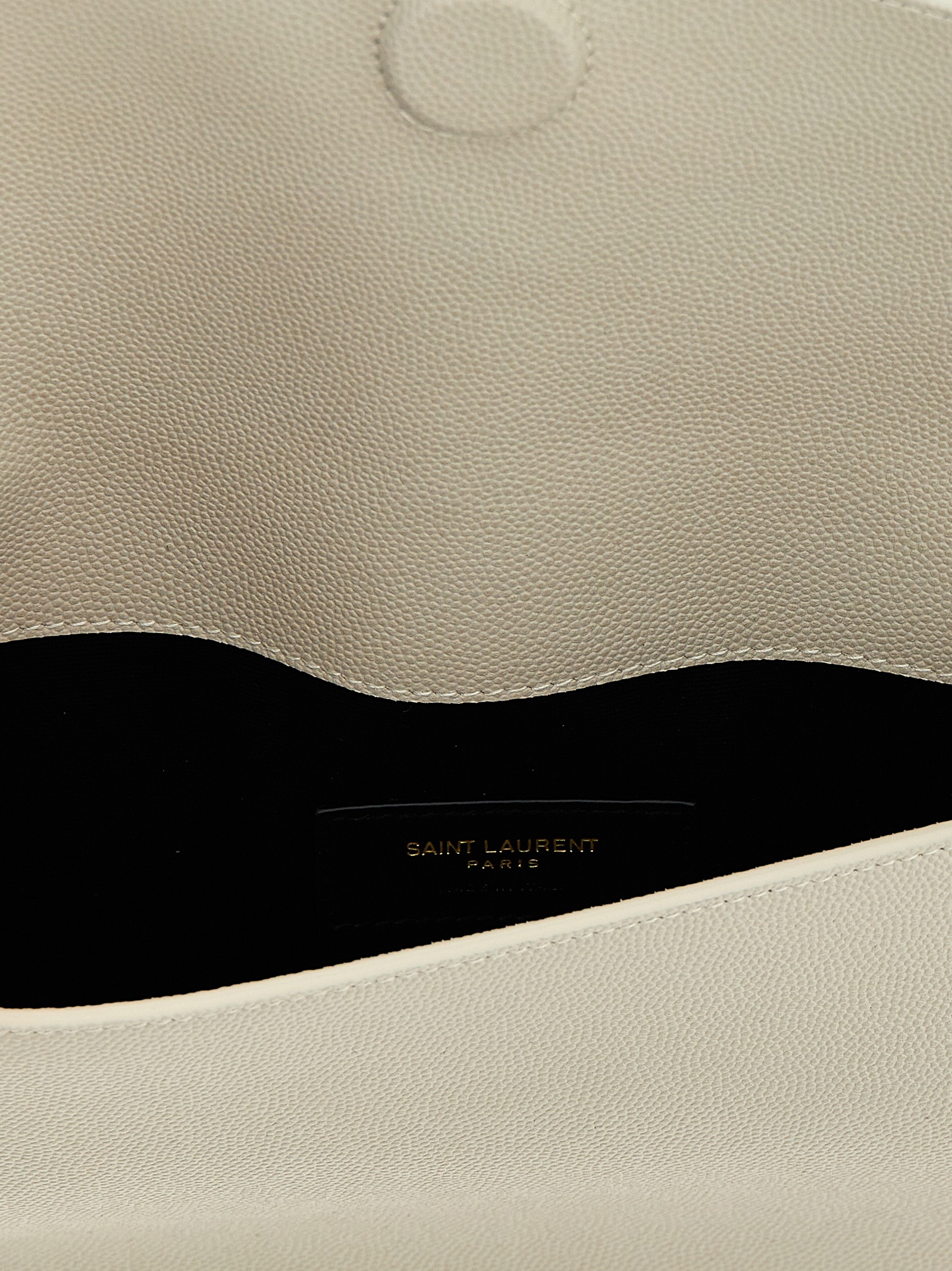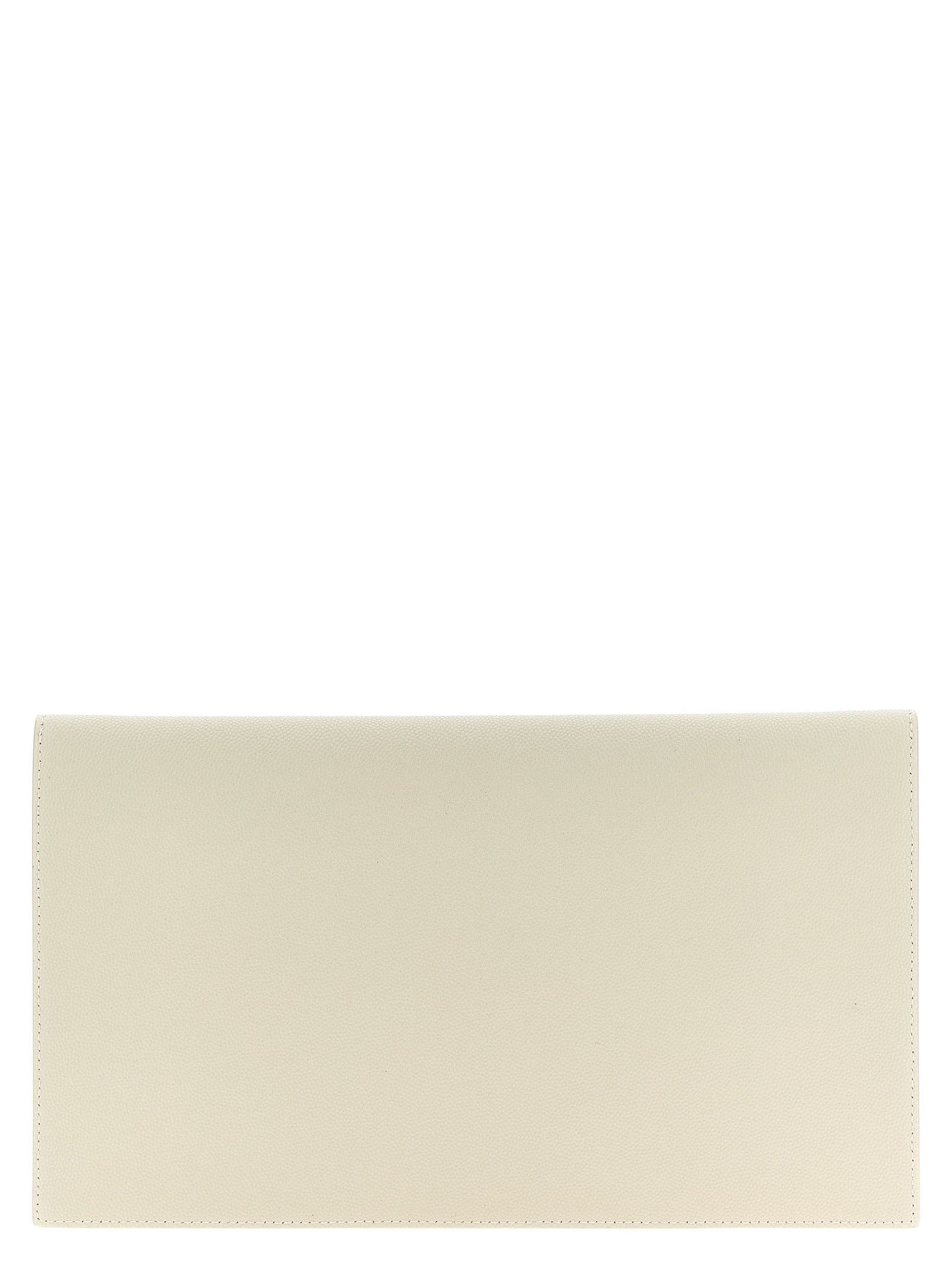 'Uptown' clutch bag in grain de poudre leather with magnetic flap closure, maxi front metal logo, envelope style.