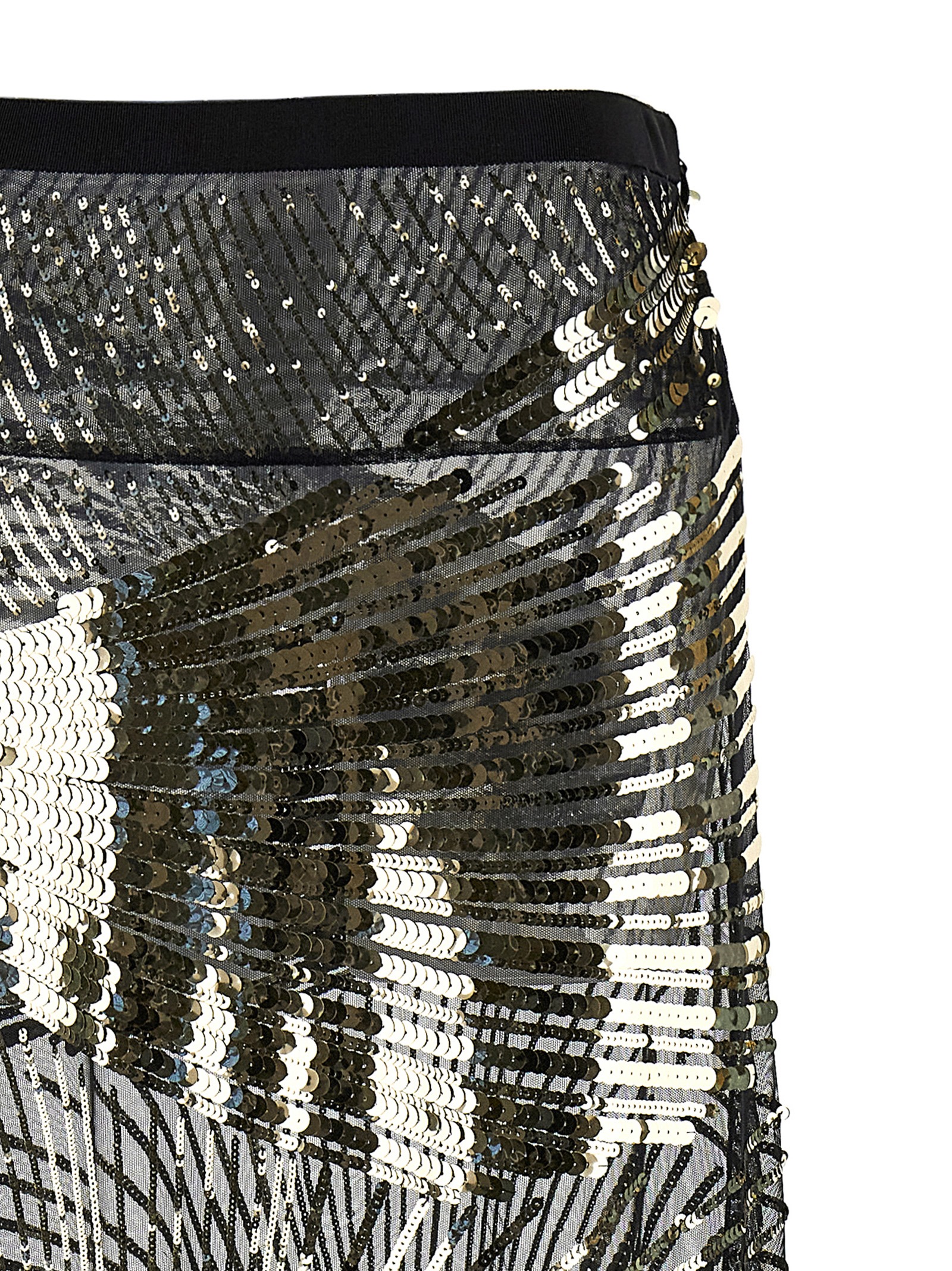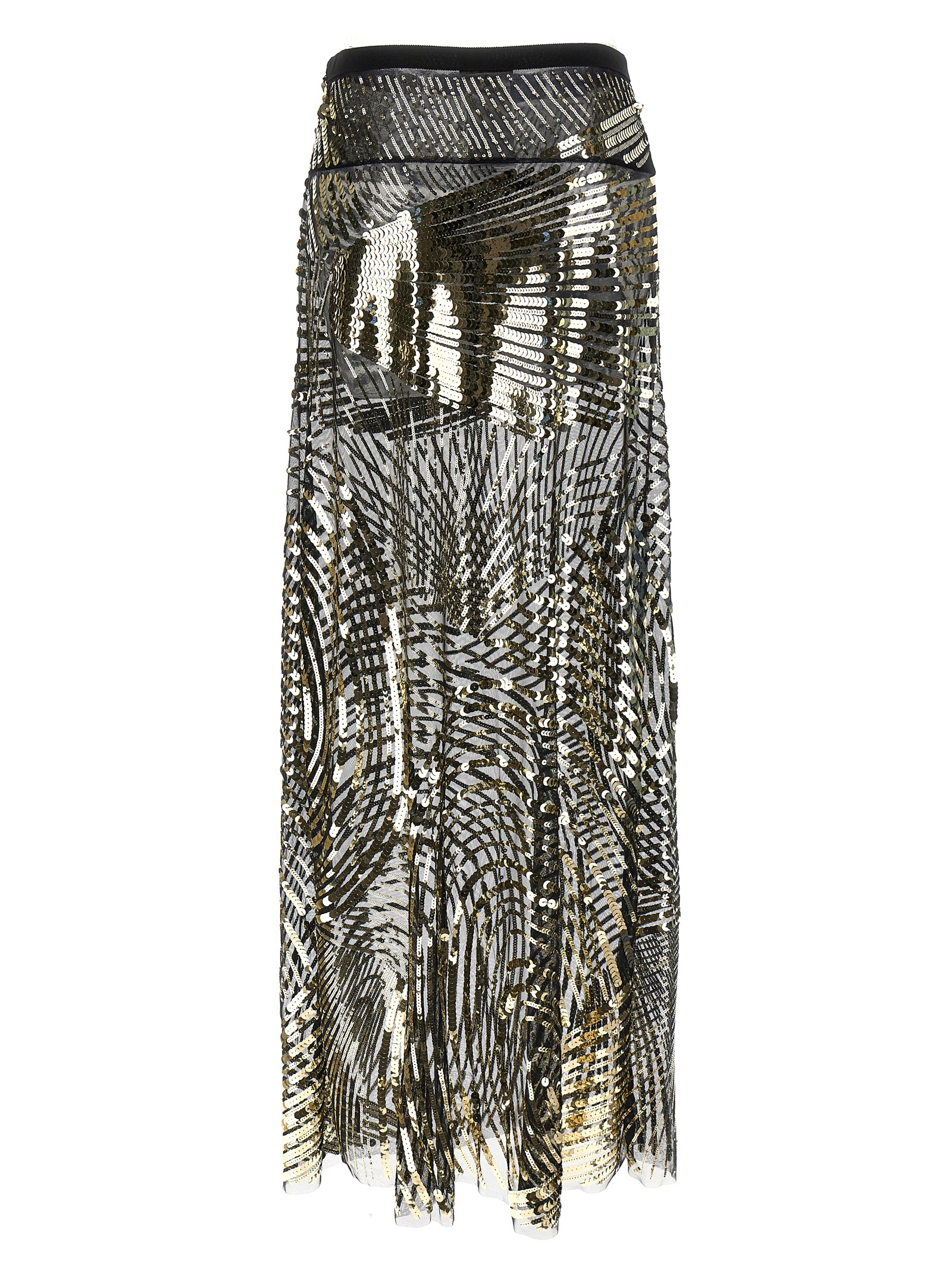Полупрозрачная длинная юбка из тюля с пайетками с узором «Iride», поясом из грогрена, боковой застежкой на молнию и крючок.