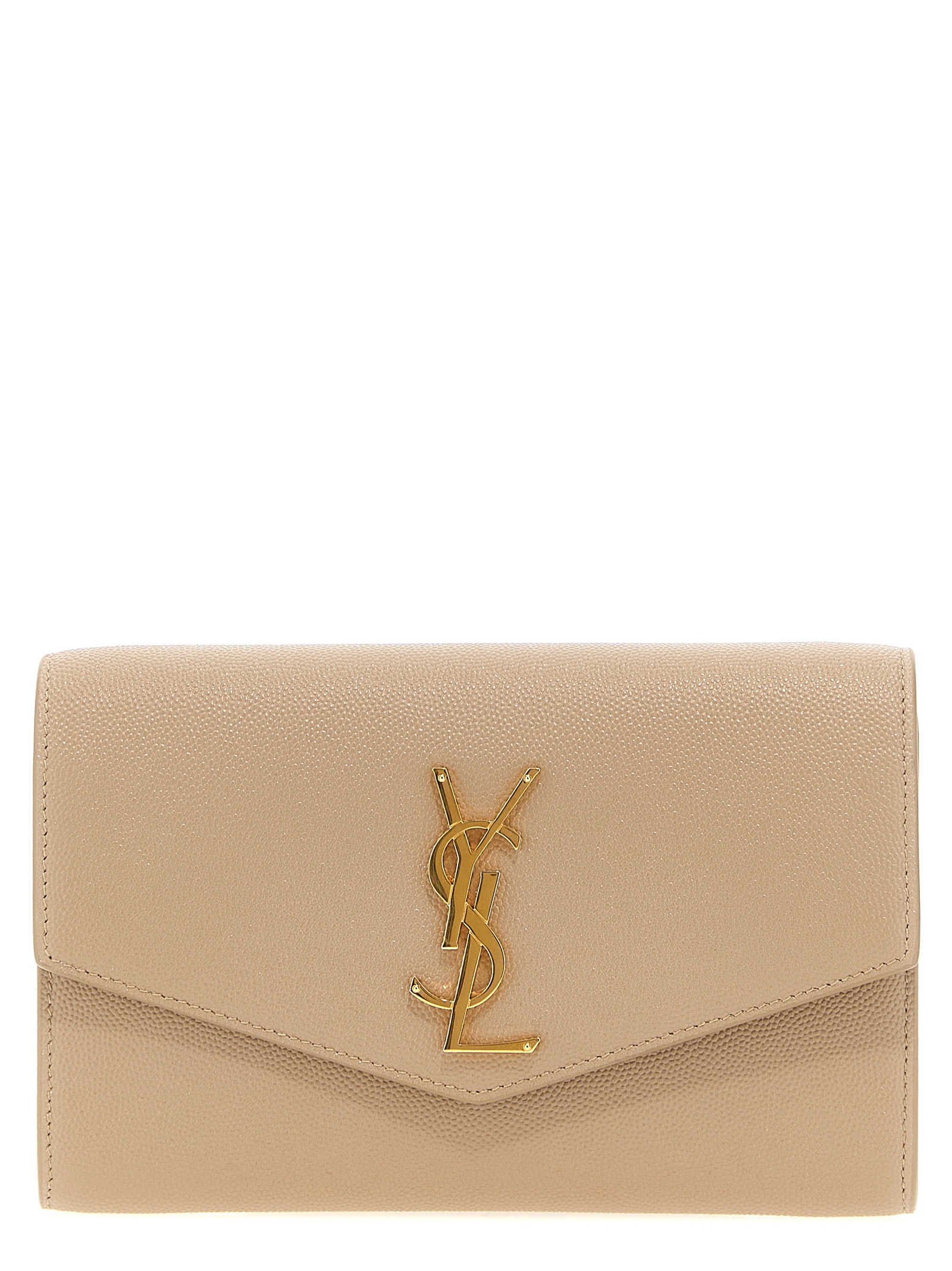 'Uptown' clutch bag in grain de poudre leather, flap closure with snap button and antiqued metal Cassandre logo applied on the front, removable chain shoulder strap, matching card holder.