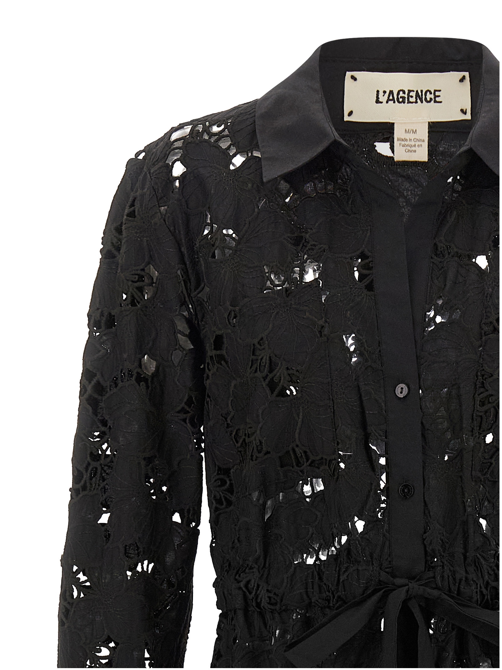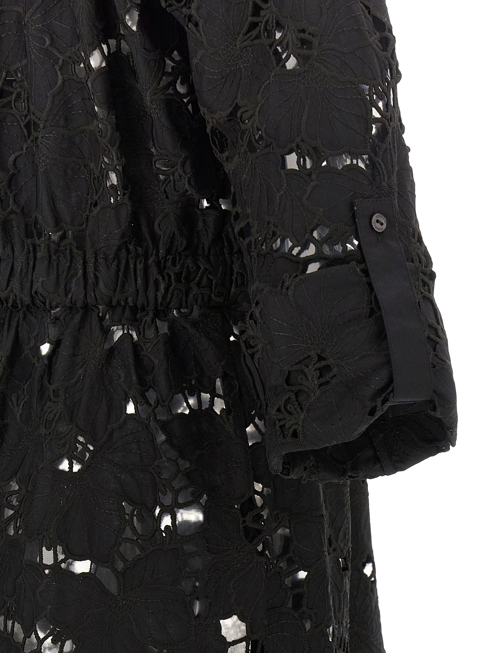 'Emilio' midi dress in floral poplin lace, chemisier model, front button closure, drawstring elastic waistband, long cuffed sleeves, asymmetrical hem, unlined.