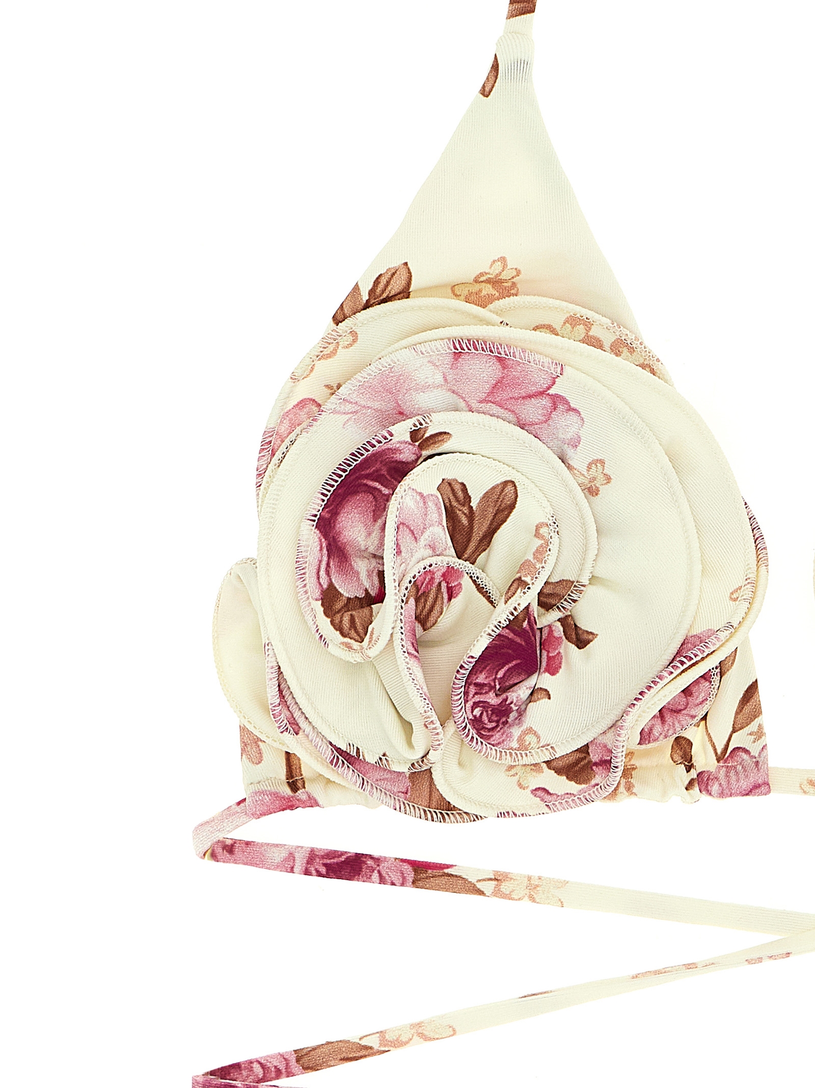 'RE26' triangle floral print bikini top with flower appliqué and adjustable closure with knotted sliding laces.