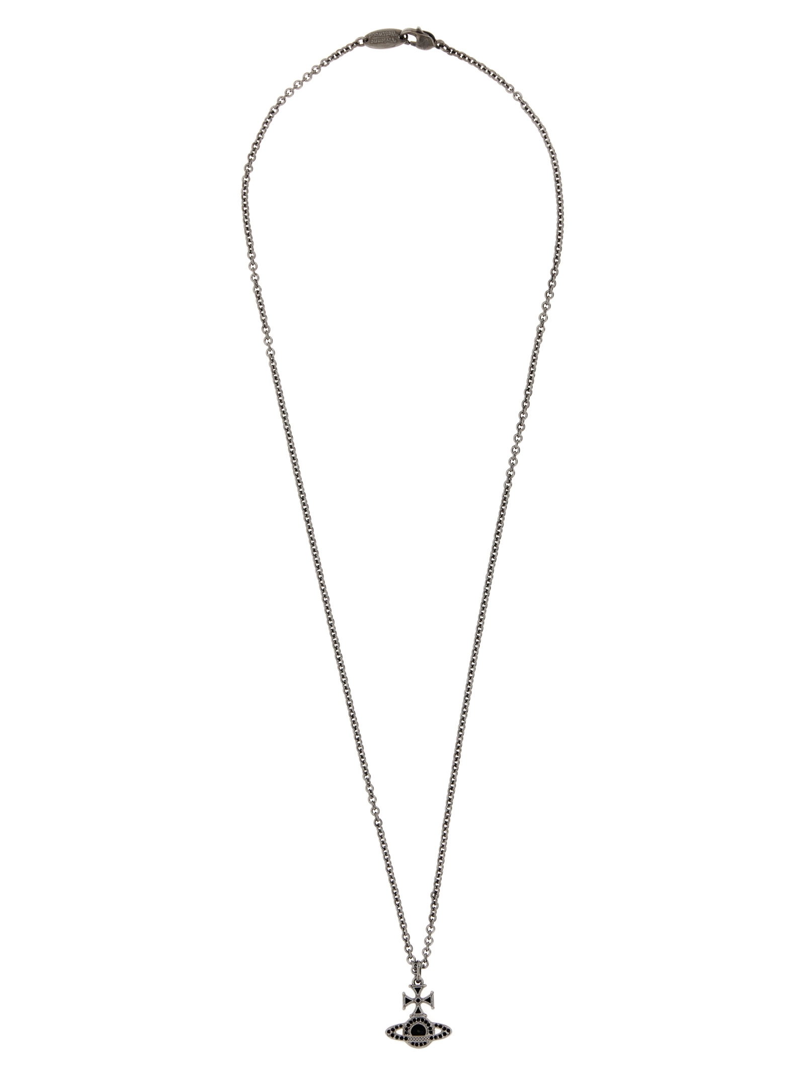 Mila' necklace in silver-plated metal, flat orb pendant with burnished rhinestones, and snap hook closure.