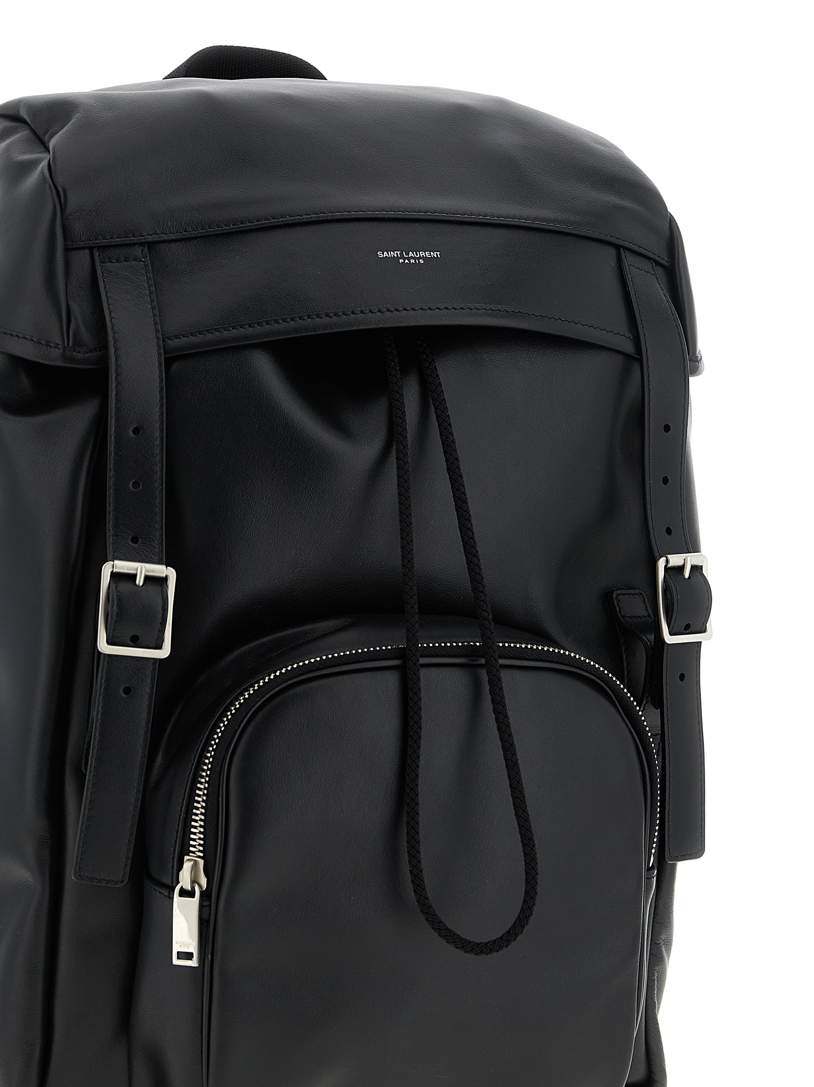 Leather backpack, flap closure with snap button and adjustable straps and embossed logo, front zip pocket, inner drawstring, fixed handle and adjustable ribbon shoulder straps, breathable technical fabric backrest.