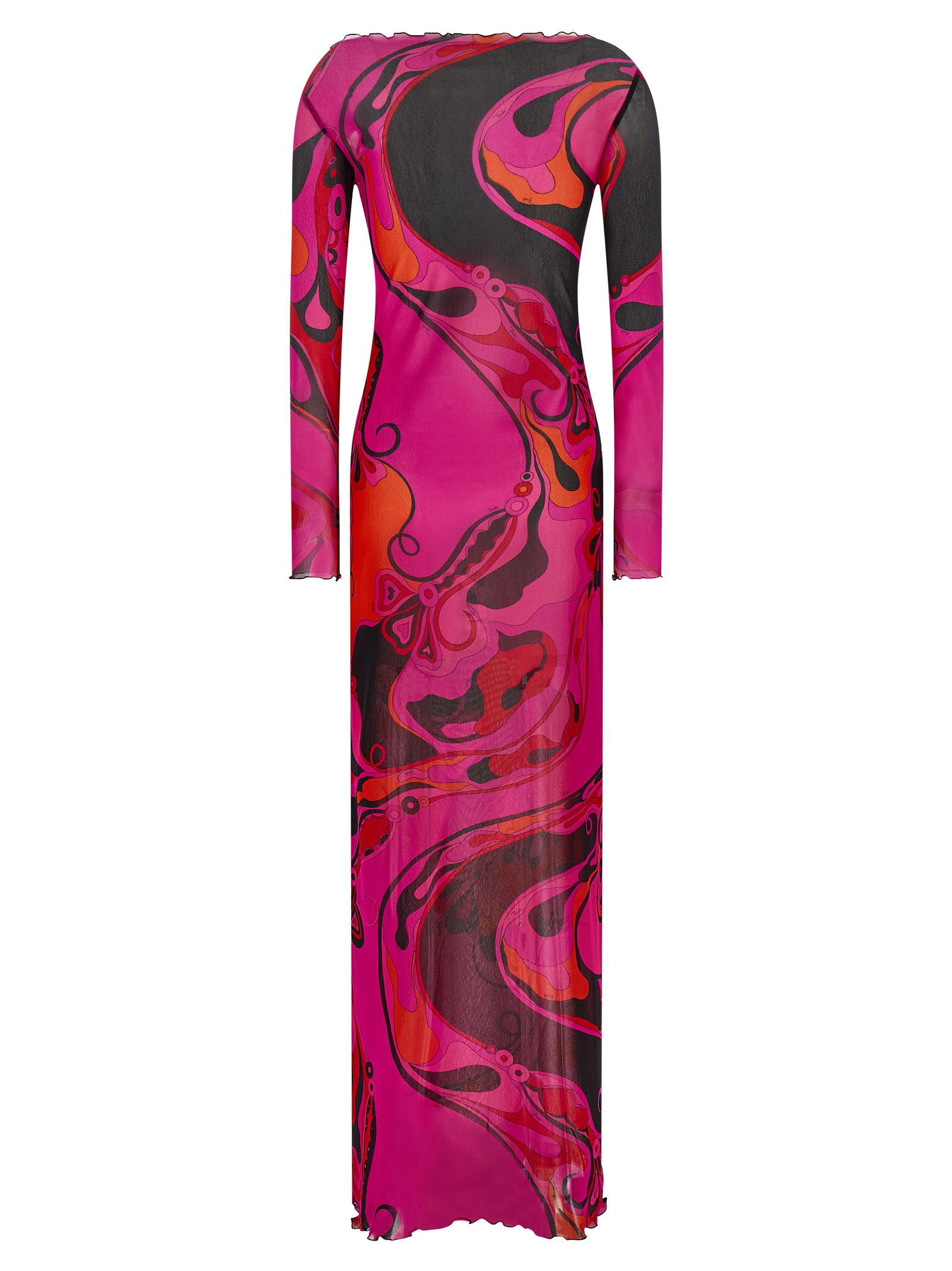 Длинное платье из полупрозрачного эластичного тюля с принтом «Орхидея», силуэт «футляр», вырез-лодочка, длинные рукава. Это изделие, как и многие другие вещи Pucci, выполнено с использованием сплошного принта, который по-разному ложится на каждое изделие; отправленное вам изделие может отличаться от изображенного на картинке.