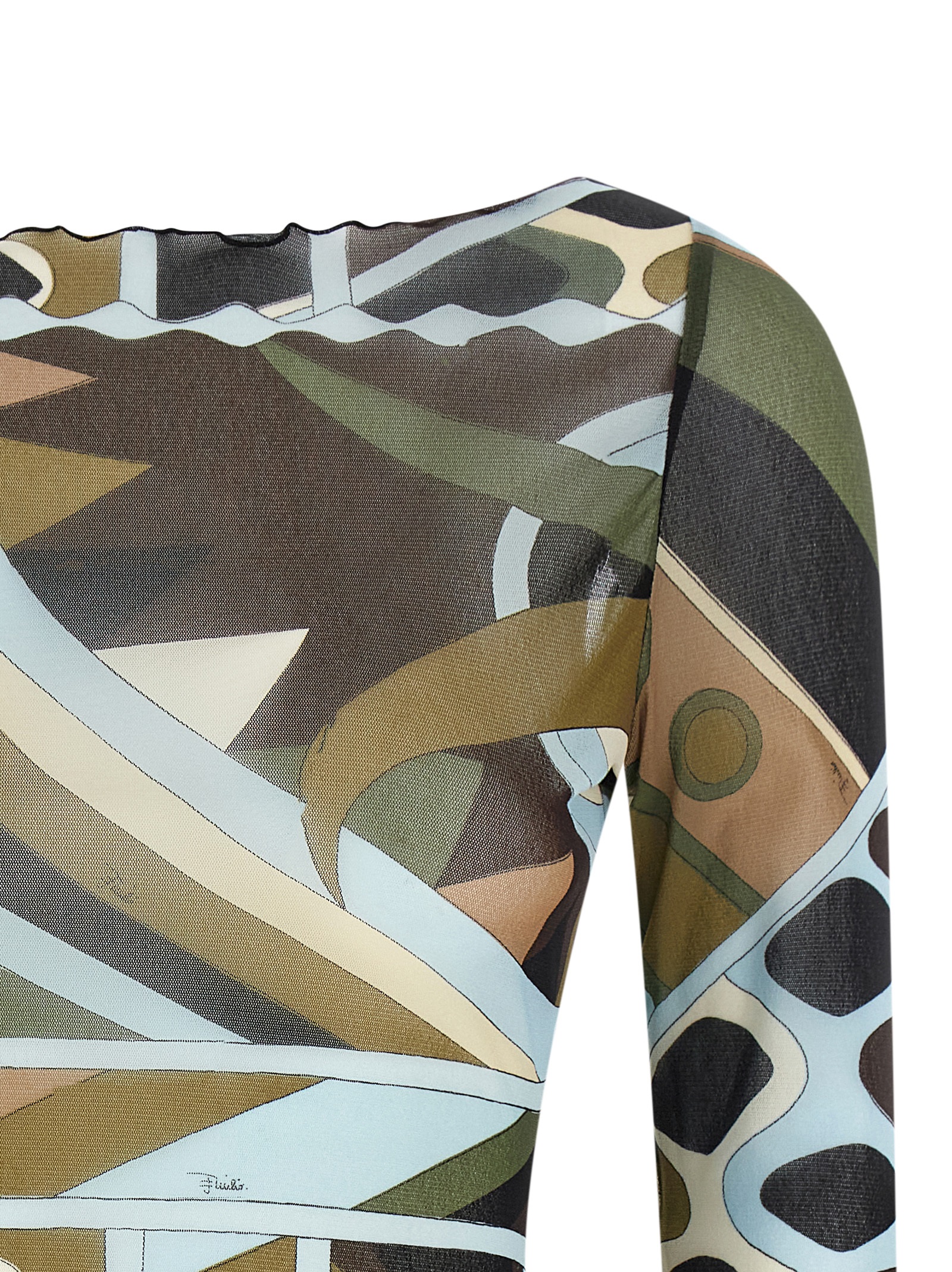 'Vivara' print semi-transparent tulle top, boat neck, long sleeves. This product, like many other Pucci items, is made with an all-over print that falls differently on each garment; The product shipped may differ from the one in the picture.