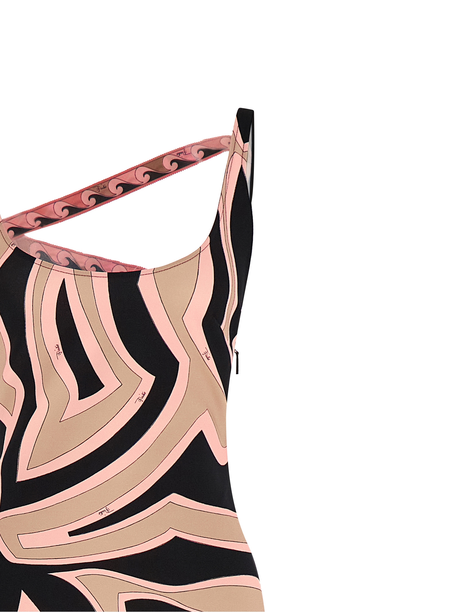 Длинное платье из «компактного трикотажа» с принтом «Лабиринт» по всей поверхности, прямой крой, застежка-молния сбоку, глубокий вырез на спине с регулируемой лентой из грогрена с принтом и пряжкой. Это изделие, как и многие другие вещи Pucci, выполнено с принтом по всей поверхности, который по-разному ложится на каждое изделие; отправленный товар может отличаться от изображенного на картинке.