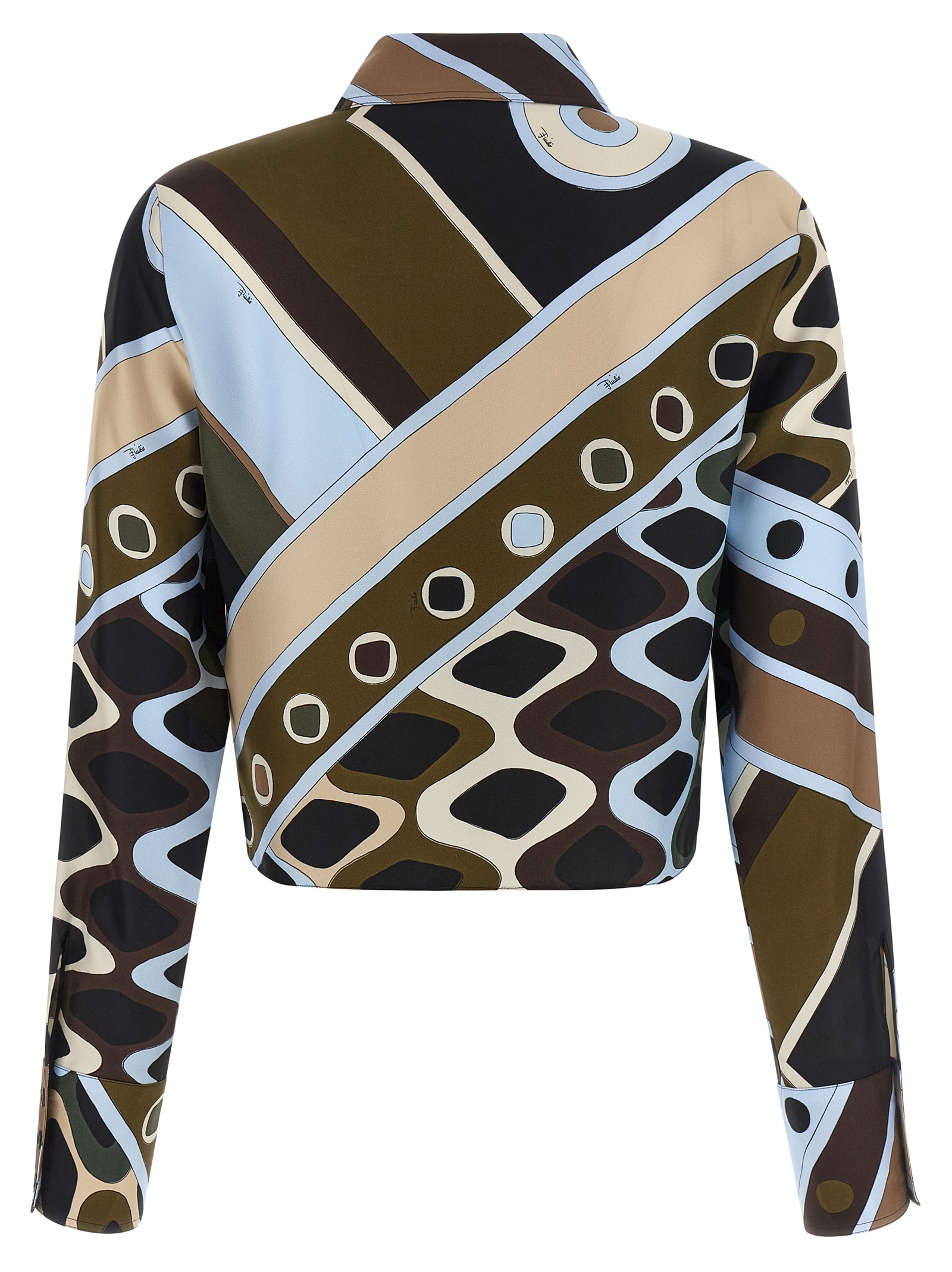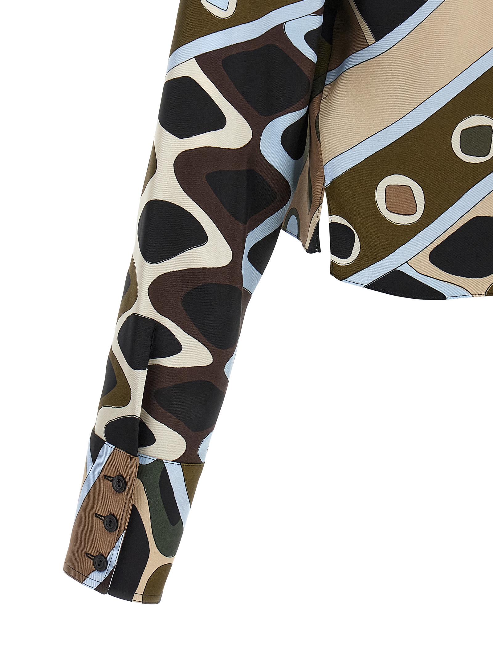 All over 'Vivara' print silk twill shirt, classic collar, crop style, front button closure, side splits, long cuffed sleeves. The placement of the print may change from the one in the picture.
