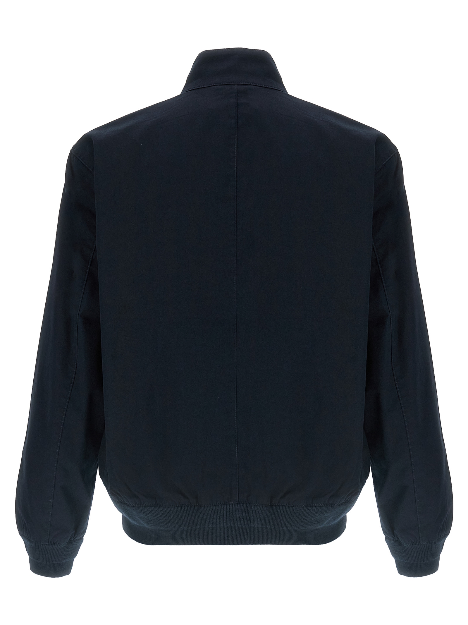 Cotton bomber jacket with front logo embroidery, zip closure, raised collar with buttons, pockets, long sleeves with knitted cuffs.