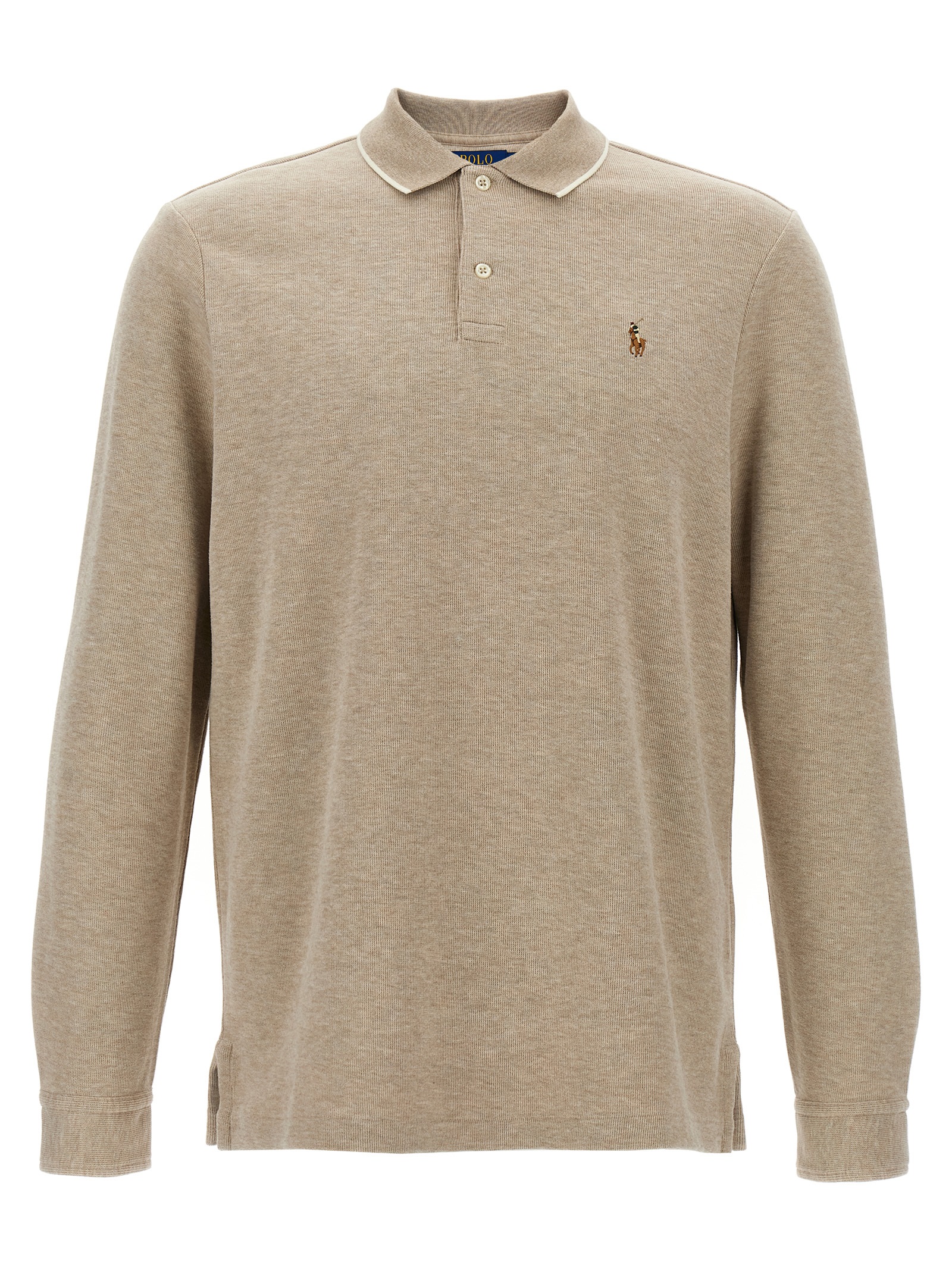 Fleece cotton polo shirt with front logo embroidery, collar and buttons, long cuffed sleeves, side slits.