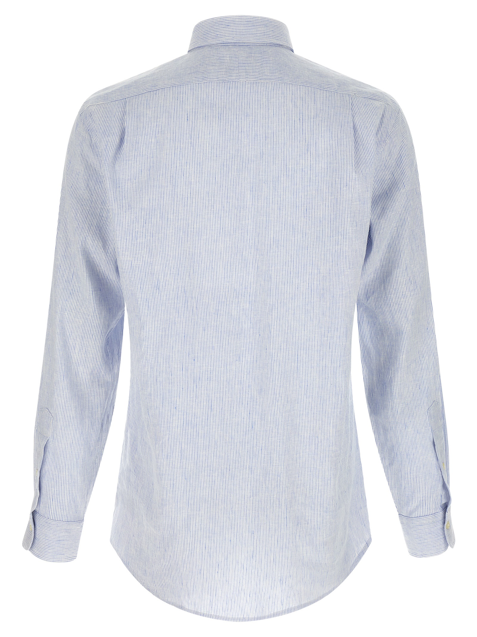 Рубашка в мелкую полоску из смеси льна и хлопка с приталенным поясом, французским воротником, контрастной вышивкой с логотипом «Pony» и застежкой на перламутровые пуговицы спереди, длинными рукавами с манжетами и закругленным низом.Характеристики товара