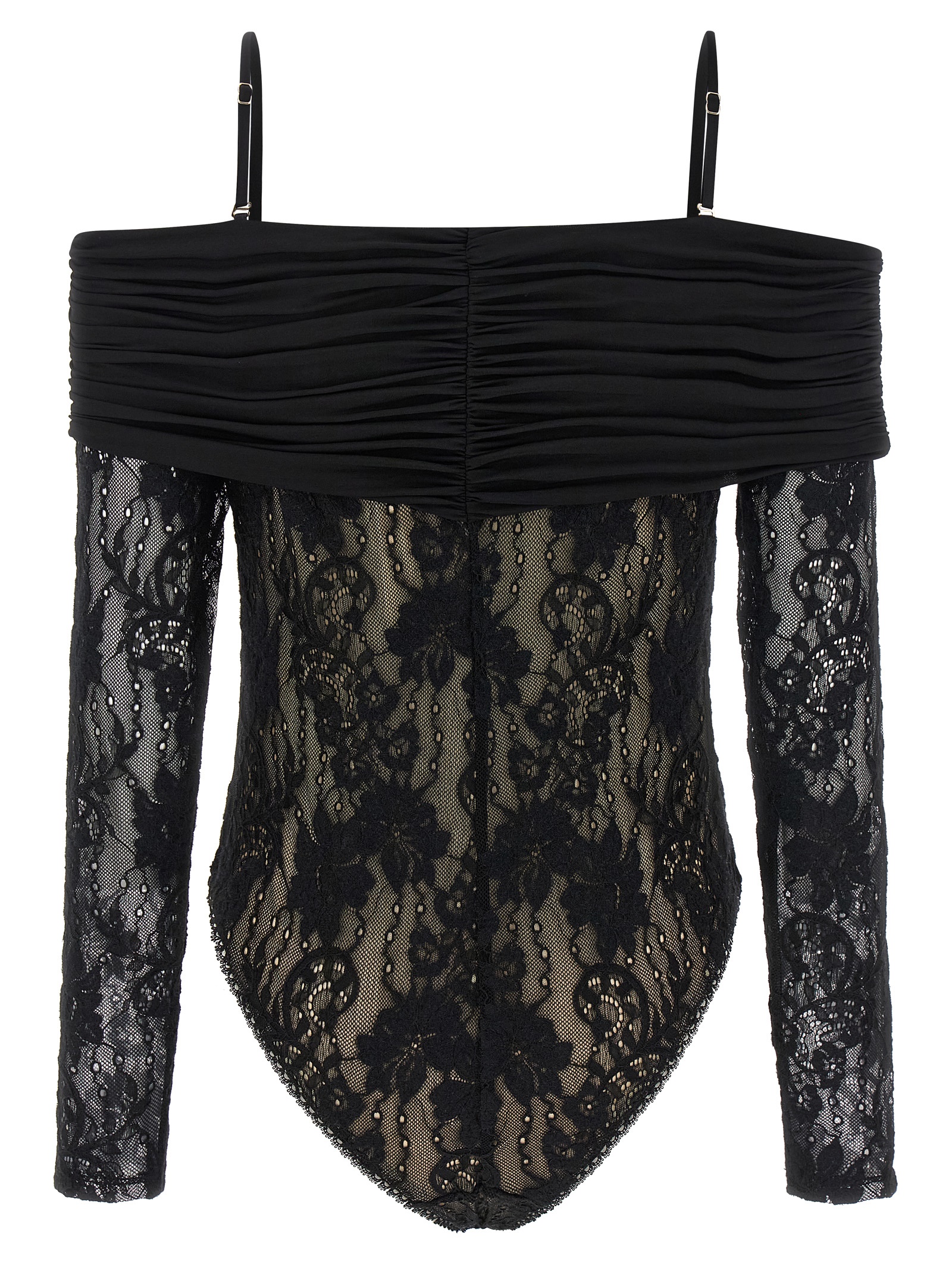 'Rebellion' stretch lace bodysuit with mesh lining, off-the-shoulder style with curled insert on the shoulders and draped cover, thin adjustable and removable straps, long sleeves, snap button closure on the hem. Twisted Romance collection.