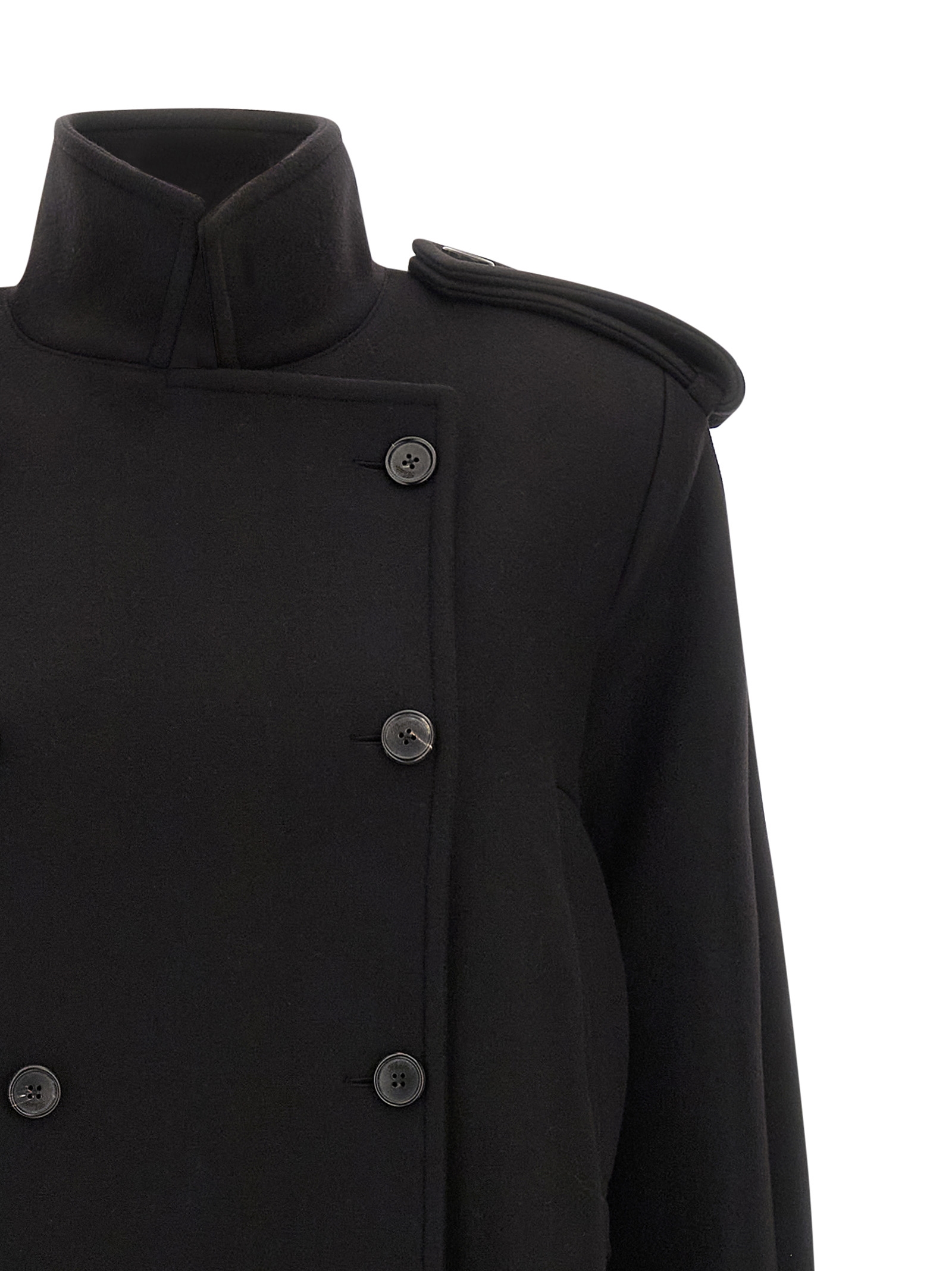 Компактное пальто Donna из меланжа с шелковистой подкладкой из купро-твила, двубортное, с застежкой на пуговицы спереди, высоким воротником, прорезными карманами, мягкими плечевыми лямками с подплечниками, длинными рукавами с регулируемыми манжетами, глубокой складкой на спине с поясом.
